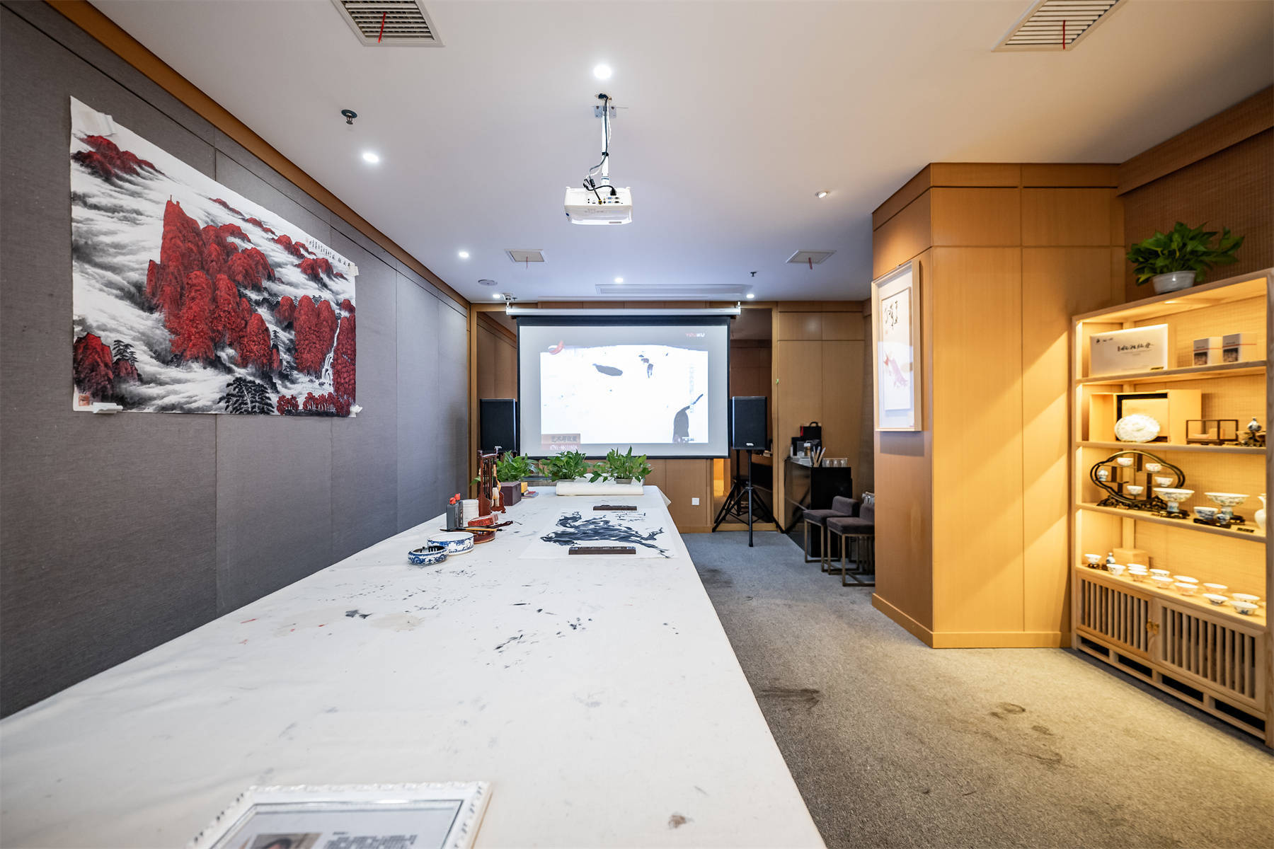 九号茶室名为秋水落霞,结合了传统文化中禅茶一味的思想,体现了繁花落尽、古朴归真的淡泊之美。墙壁上装饰着刘勇亮老师的夜游赤壁山水画,老师不吝笔墨地写出了赤壁夜游的意境,安谧清幽、奇异惊险的景物更令人心胸开阔、境界高远。整幅画意境优美,如明月下的江水,如微风吹拂梅花的幽香。禅茶文化的精髓是“正、清、和、雅”,追求的是一种清雅、淡泊的雅致,更多的是一种悠闲、悠闲的“雅举”。正所谓“淡极始知花更艳”,淡雅应是生活的原色,来到三陆玖,坐在窗前,喝着清茶,品茶赏画,在喧嚣的生活中体悟人生。