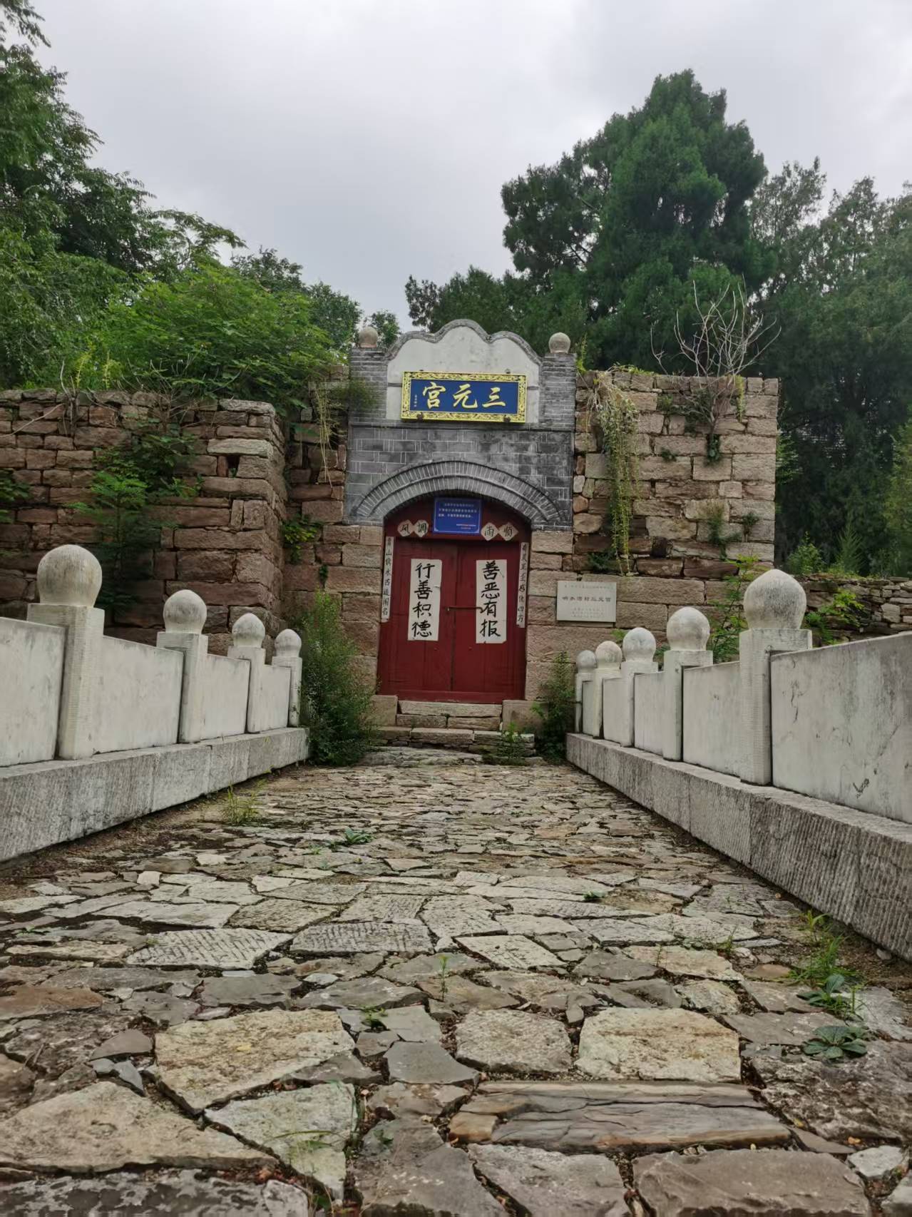 沿着古道来到村庄东北方向,这里有一座道教宫殿三元宫,从古德范和南文字村东流过来的两条河,在三元宫北侧交汇,沿着三元宫西侧流去。以前还有一条水道,从宫东侧绕到宫前石桥下,村里一直流传三元宫位于五条龙聚集之地。两条河被称为两条水龙,东西两侧各有一道石梁像石龙一样延伸到宫附近,另外还有一道土坡延伸到这里,周围地势低,三元宫像点缀在山水之间的珍珠,被村民称为“五龙戏珠”。