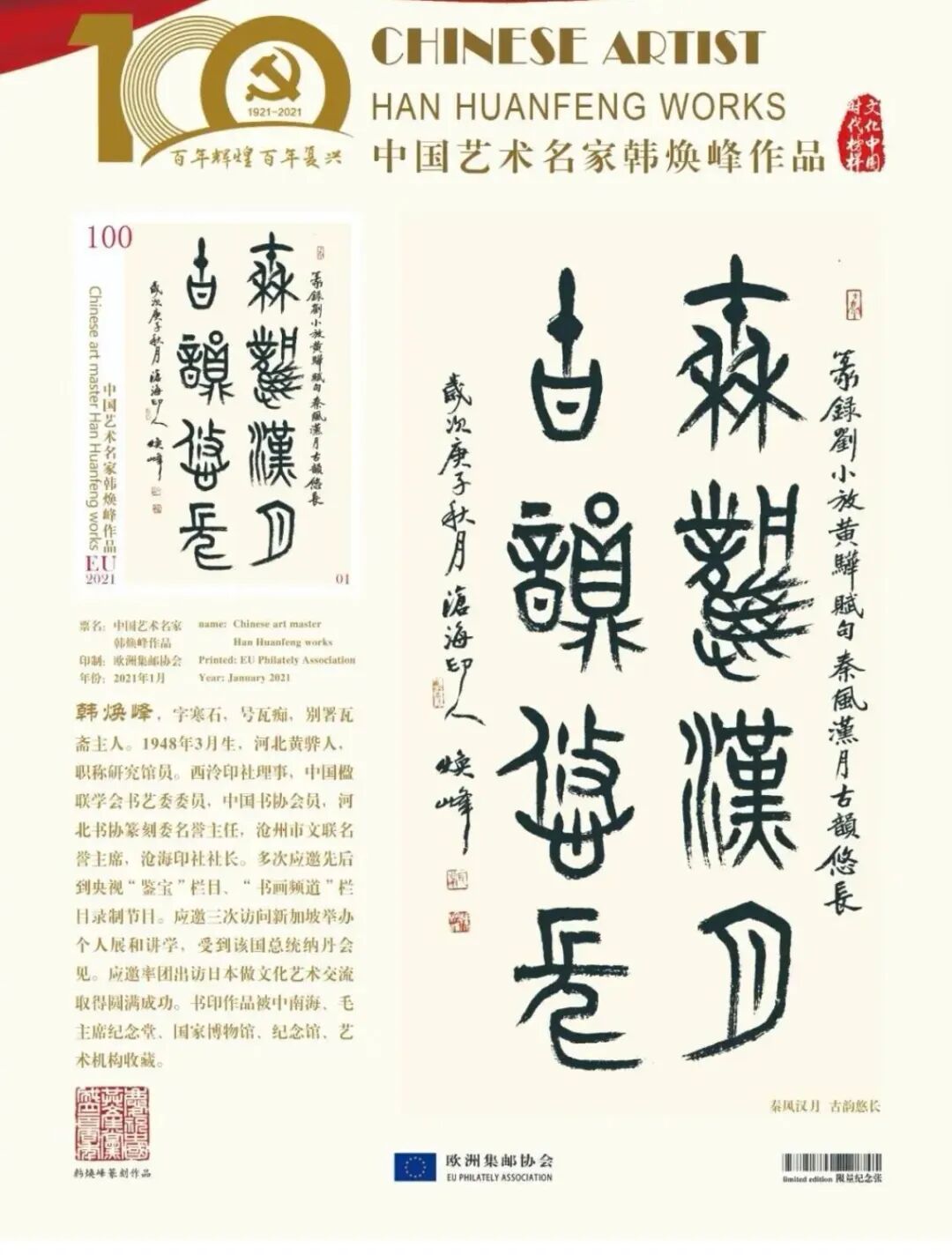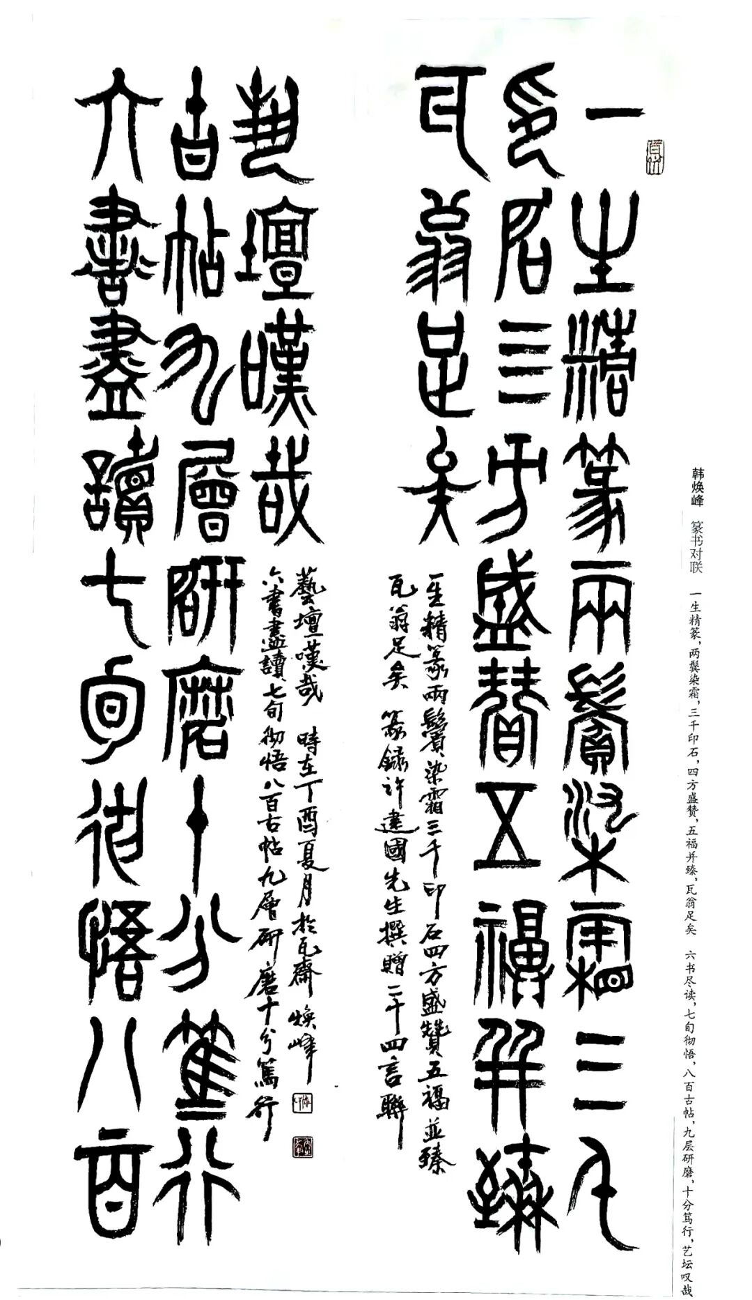 韩焕峰 字寒石,号瓦痴,别署瓦斋主人。生于1948年3月,河北黄骅人。任职于沧州,博物馆研究员。西泠印社理事,中国楹联学会书艺委员会委员,中国书协会员,河北书协篆刻委员会名誉主任,沧州市文联名誉主席,沧州国学院第一副院长,沧海印社社长。担任“百年西泠·中国印”大型篆刻海选活动,“金石弘源”大型国际篆刻选拔赛,第九、十、十一届篆刻评展;首届“介堪 去疾杯”全国泰顺石篆刻大赛,“吴昌硕国际艺术奖”诗书画印大赛等复审评委。“东楼书院杯”《诗经》篇目全国书法篆刻大展评委会主任。先后在国内外报刊发表作品数千方(幅),撰写新闻、隨笔、散文、评论、考正、学术文章约30余万字,收录专集数百部。篆刻作品先后六次在日本展出,在韩国参加“第二届国际篆刻艺术大展”,篆刻作品搭载“神七”遨遊太空,杭州G2O国际峰会为南非总統刻“祖马”印作国礼,参加上海世博会等等,饮誉港澳台以及东南亚新、马、加、等国家和地区。先后应邀到央视“鉴宝”栏目、“书画频道”栏目录制节目。应邀在人民大会堂参加“大美之春”和“榜样春晚”大型春晚节目录制。三次被邀访问新加坡并举办个人展和讲学,受到该国总统纳丹会见。应邀率团出访日本做文化艺术交流取得圆满成功。书印作品被中南海、毛主席纪念堂、中共党史馆、国家博物馆,纪念馆、艺术馆和有关机构收藏。