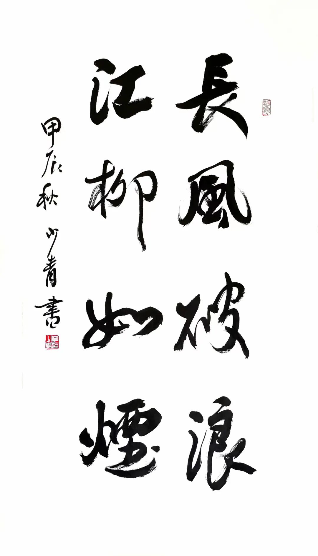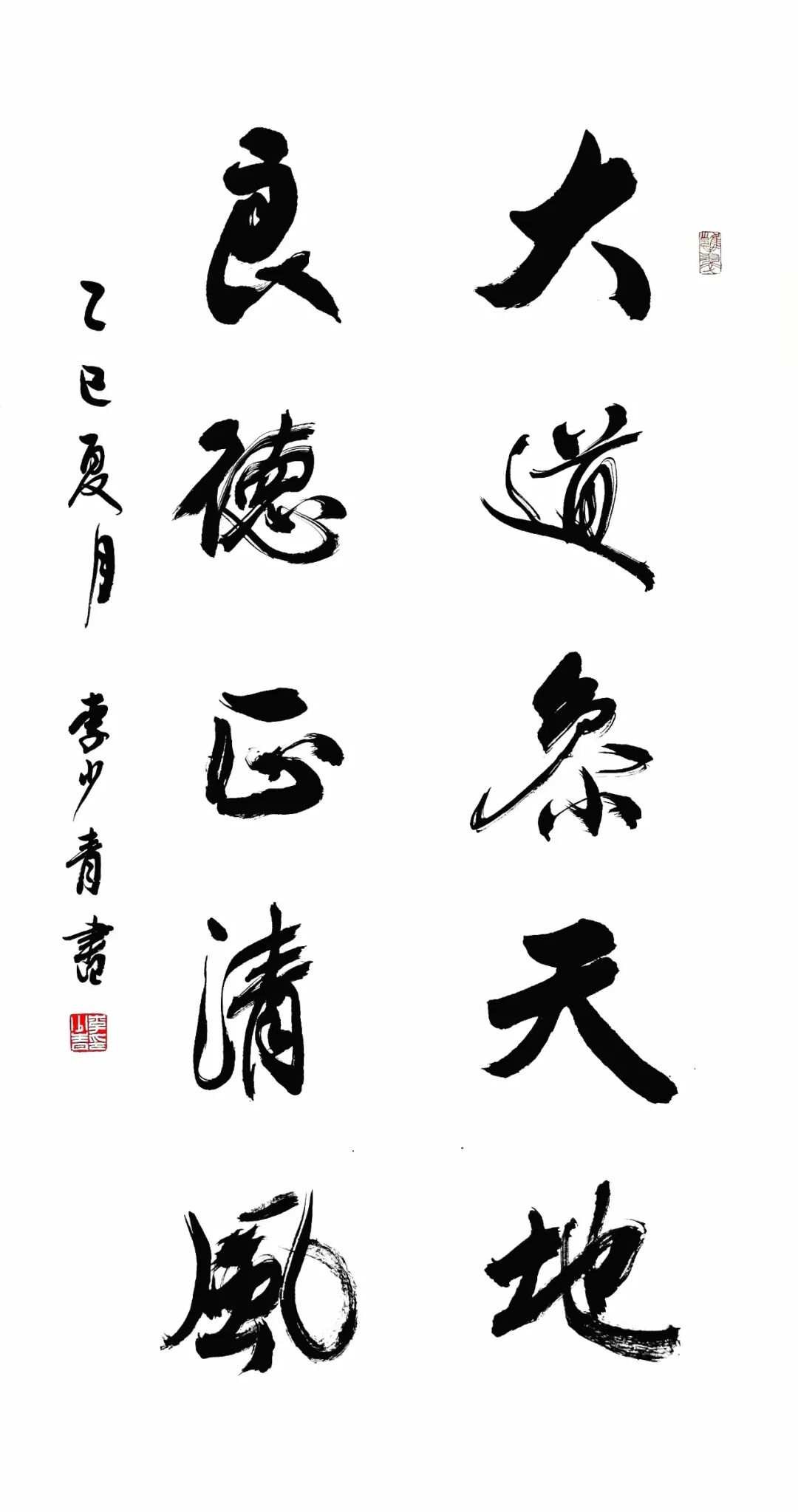 李少青的书法风格独具一格,既有书卷气,又有“外交范”。北京大学教授评价他的书法:“李铎是军人,字里充满阳刚;李少青是外交官,作品有全球视野,呈绵里藏针、柔中带刚之貌。”他的书法以行草为主,兼写楷、隶、榜书,取法“二王”、怀素、王铎,又参父亲李铎“钢筋铁线”般的中锋绞转,形成了流美而挺拔的线条。他的结字疏朗通透,行距开阔,契合现代展厅与外交场合“远观得体、近看有味”的需要。他的作品诗、书一体,常自作诗词或录中外名篇,书卷气与“外交辞令”式的雅致并存。他的书法作品不仅展现了他深厚的艺术功底,更体现了他作为外交官的视野和胸怀。