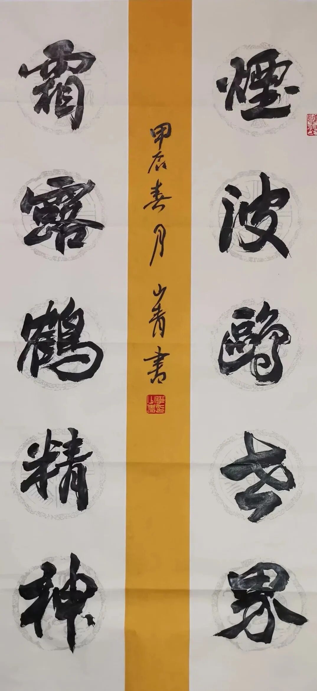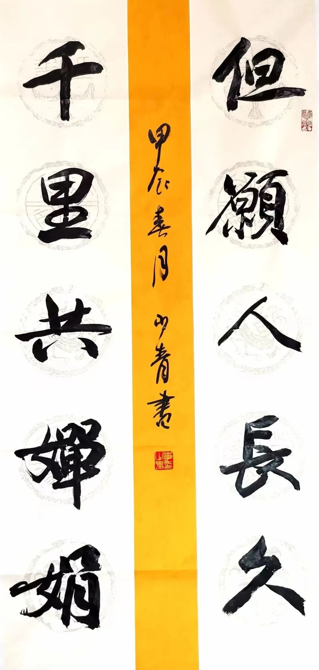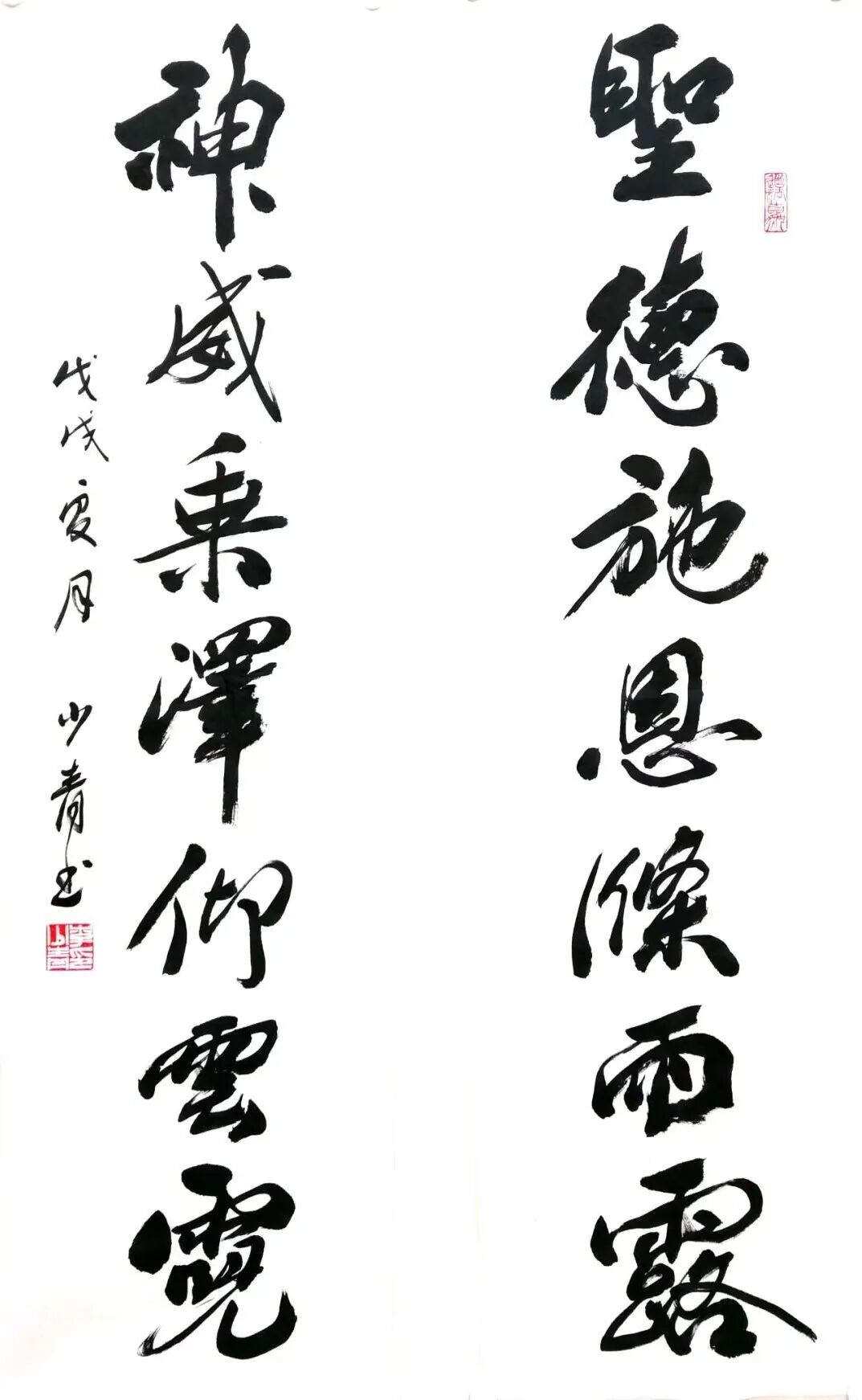 《古柏参天经岁月 高墙立地历沧桑》(李少青联并书)138x69cm 2025