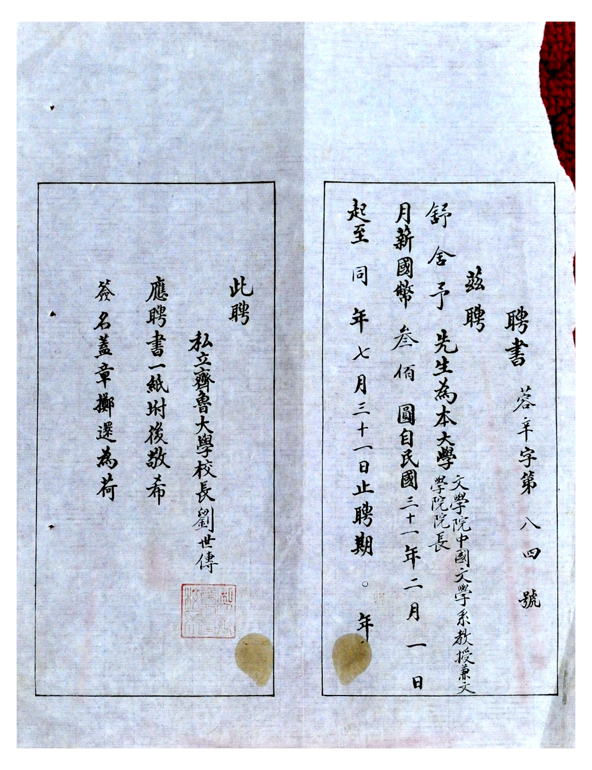 聘书 蓉辛字第八四号,兹聘舒舍予先生为本大学中国文学系教授兼文学院院长,月薪国币三百元,自民国三十一年二月一日起至同年七月三十一日止聘期 年。此聘 私立齐鲁大学校长刘世传(印)应聘书一纸附后敬希签名盖章掷还为荷。