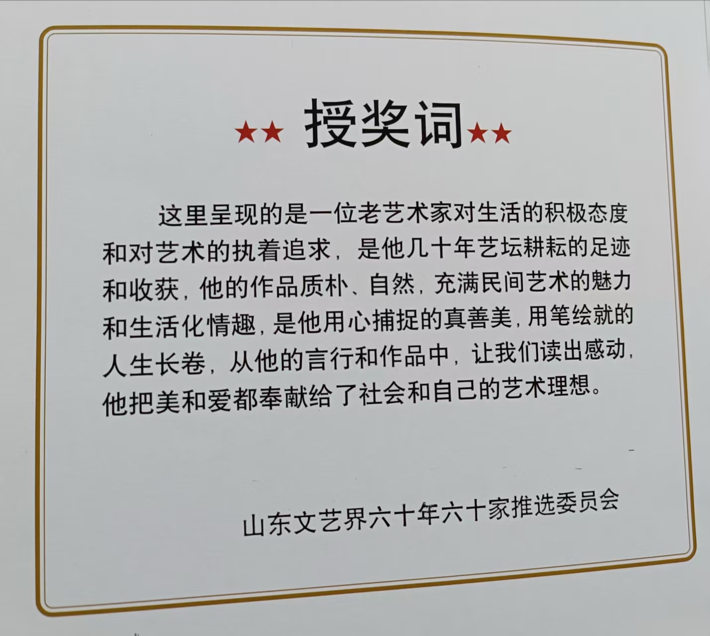 山东省文艺界推选委员会给他的授奖词是:“这里呈现的是一位老艺术家对生活的积极态度和对艺术的执着追求,是他用心捕捉的真善美,用笔绘就的人生长卷,从他的言行和作品中,让我们读出感动,他把美和爱都奉献给了社会和自己的艺术理想。”