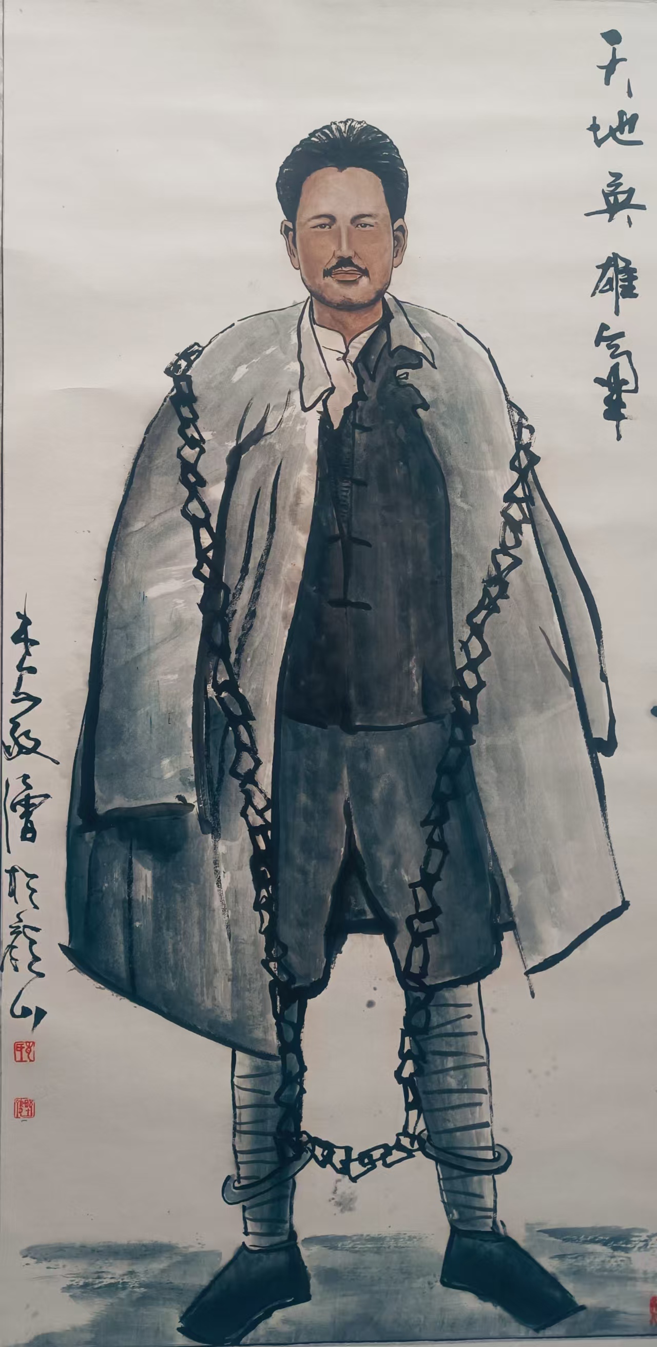 含着眼泪,三天即完成了《天地英雄气》由草图到作品的创作。虽然画完后仍有遗憾,但方志敏烈士大义凛然宁死不屈的伟大形象,却通过我的画笔实实在在的表现了出来。那沉静如水的五官、挺拔如松的身材和革命者所独有的坦荡、坚定、决绝与浩然正气,无不令观者受到震撼。
