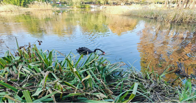 小西湖里的几只悠闲的黑天鹅在芦苇从中觅食,成群的麻雀叽叽喳喳的掠过水面,停留在水边片刻,便又呼啦的飞了起来,跃上了树梢。在湖心的六角飞檐凉亭的不远处,一对黑天鹅的红唇相依触碰,多情温婉而憨态优雅,透露出绅士般相仪的气质,那是生命欢愉的尘世之歌。