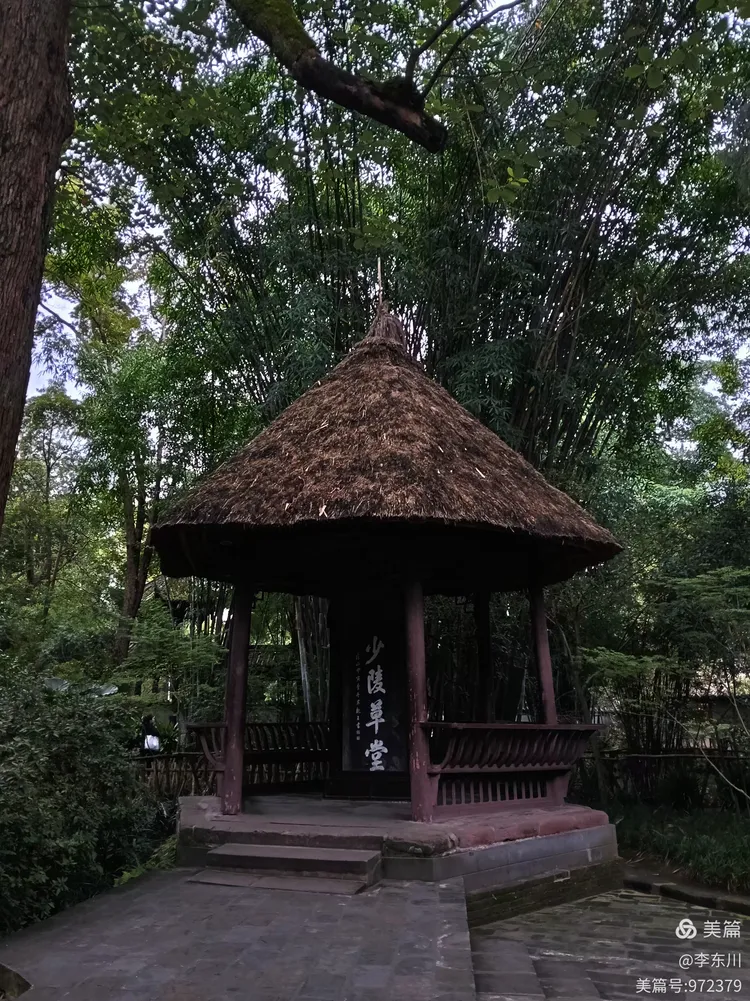 那天一共见了有十多个人吧,其中一个人给我留下的印象最深,他戴着一副深度近视眼镜,围着“少陵草堂”碑转了一圈,就在草堂围廊上坐下了,他似乎若有所思,静静的坐着。