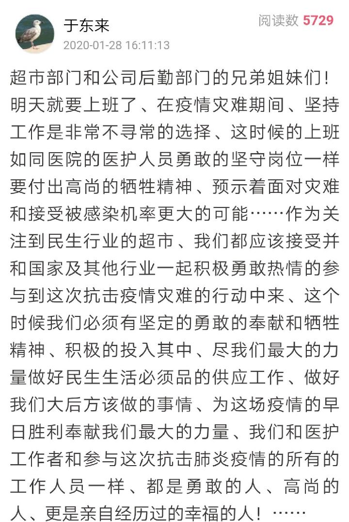 河南省许昌市胖东来作为零售业的标杆闻名全国,说胖东来模式为全国零售业朝拜基地也不为过。胖东来掌门人于东来是个有情怀有担当有责任感的企业家,汶川大地震期间,于东来亲自率领胖东来员工带着捐助物质冒着余震危险奔赴汶川去支援,许昌人为此骄傲他们的于东来。就在1月25号,于东来在随笔分享里说: