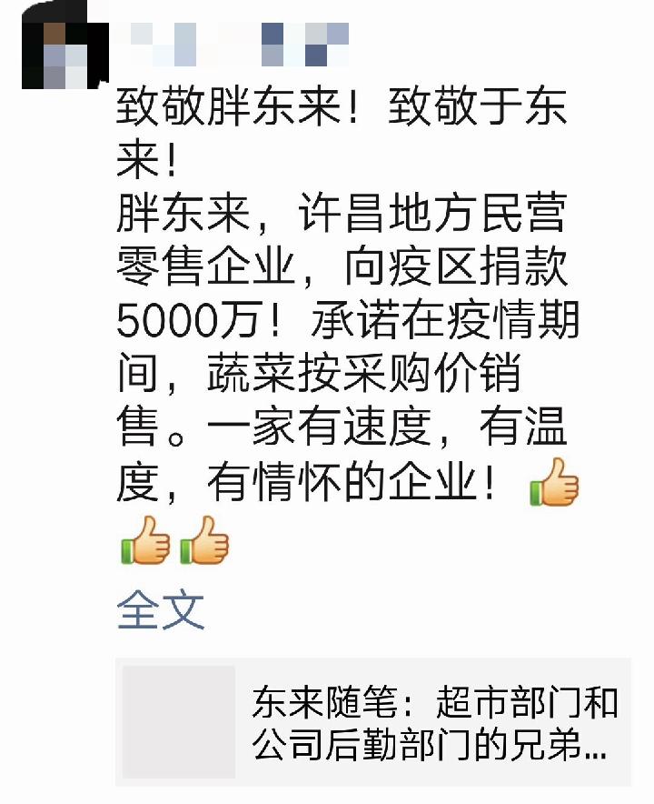 胖东来捐资五千万助力国家抗击疫情,一个零售企业捐助五千万给国家,于东来的家国情怀感,带着许昌人民的大爱之心,呈现给国家和世人。于东来,许昌人民的骄傲!许昌人民一次又一次的在微信朋友圈刷屏,高呼“大爱我们的东来哥”……