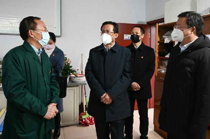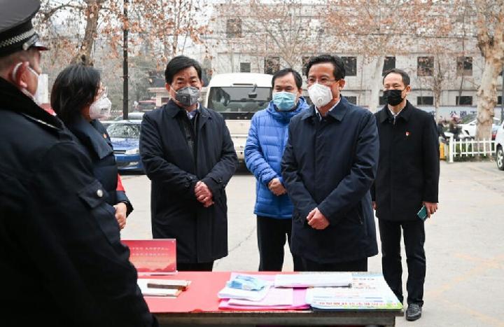 在五一路街道碧水名郡小区,丁部长察看了小区门口的车辆、人员出入登记表,询问了人员值班安排情况,叮嘱值班人员要做好自身防护,密切关注外来车辆和群众,发现发烧人员要及时上报。