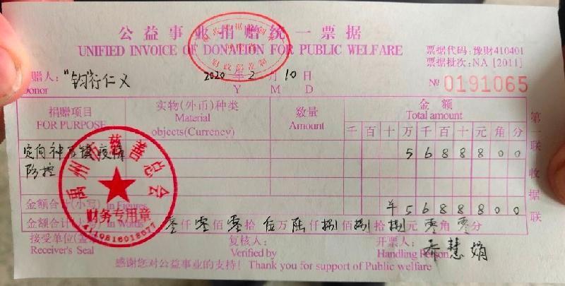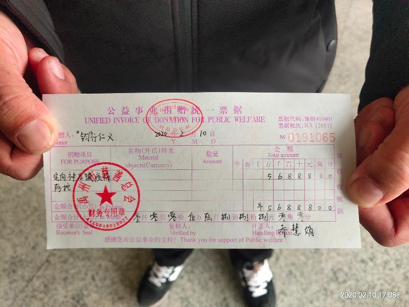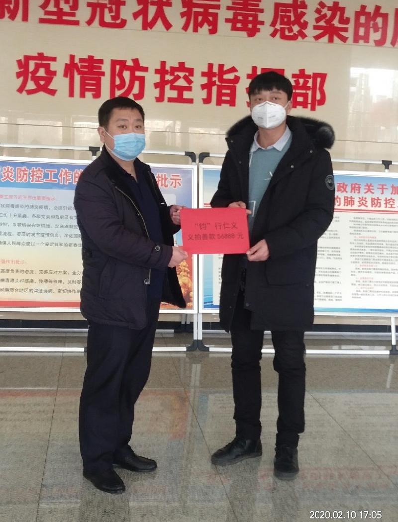 当天下午,此次活动的发起人郗小冬作为众筹活动组的代表,前往禹州市慈善总会,将拍卖所得的56888元现金全部定向捐献给禹州市神垕镇疫情防控工作。