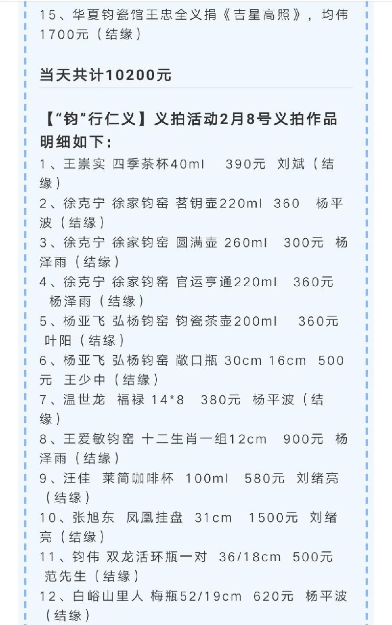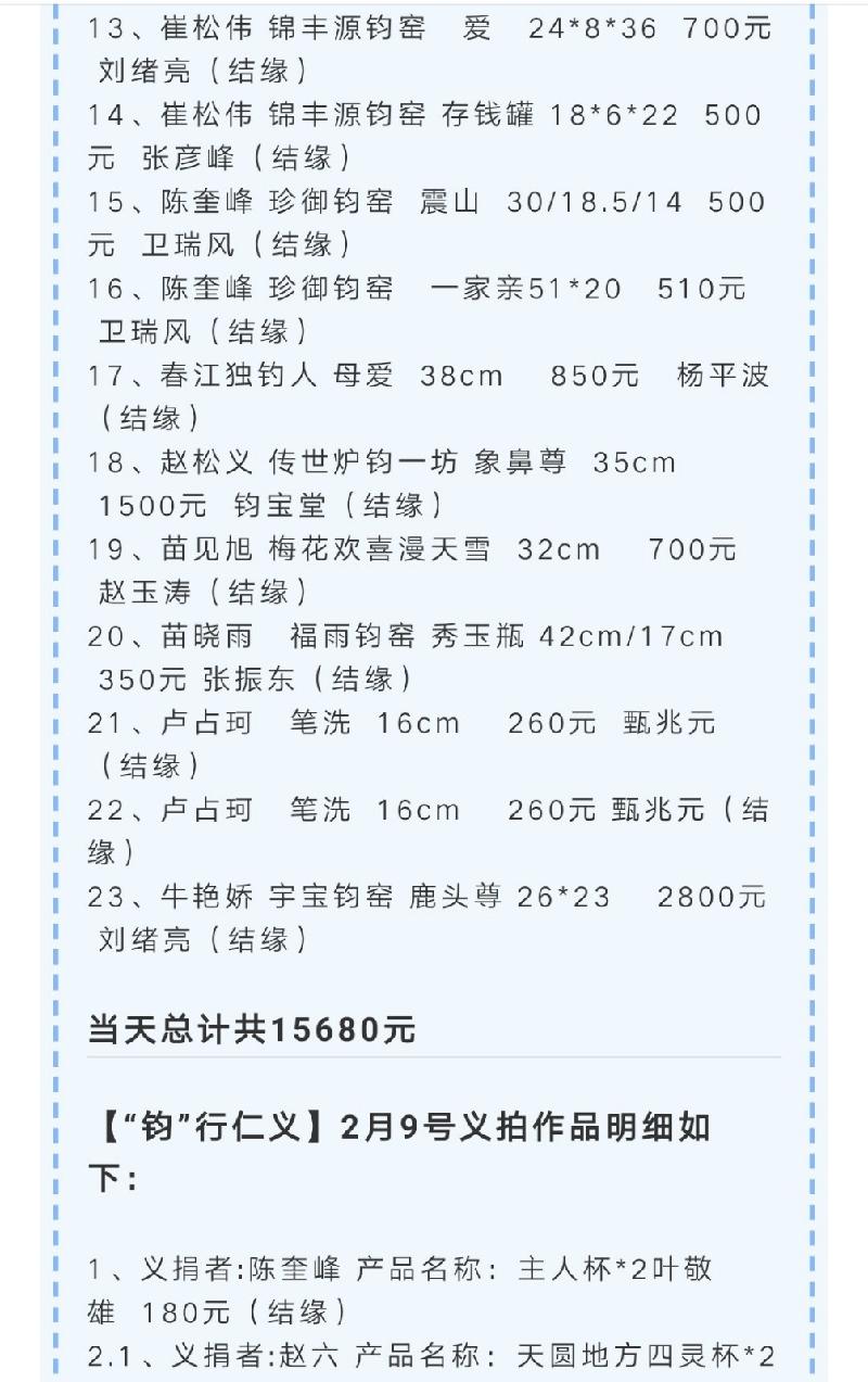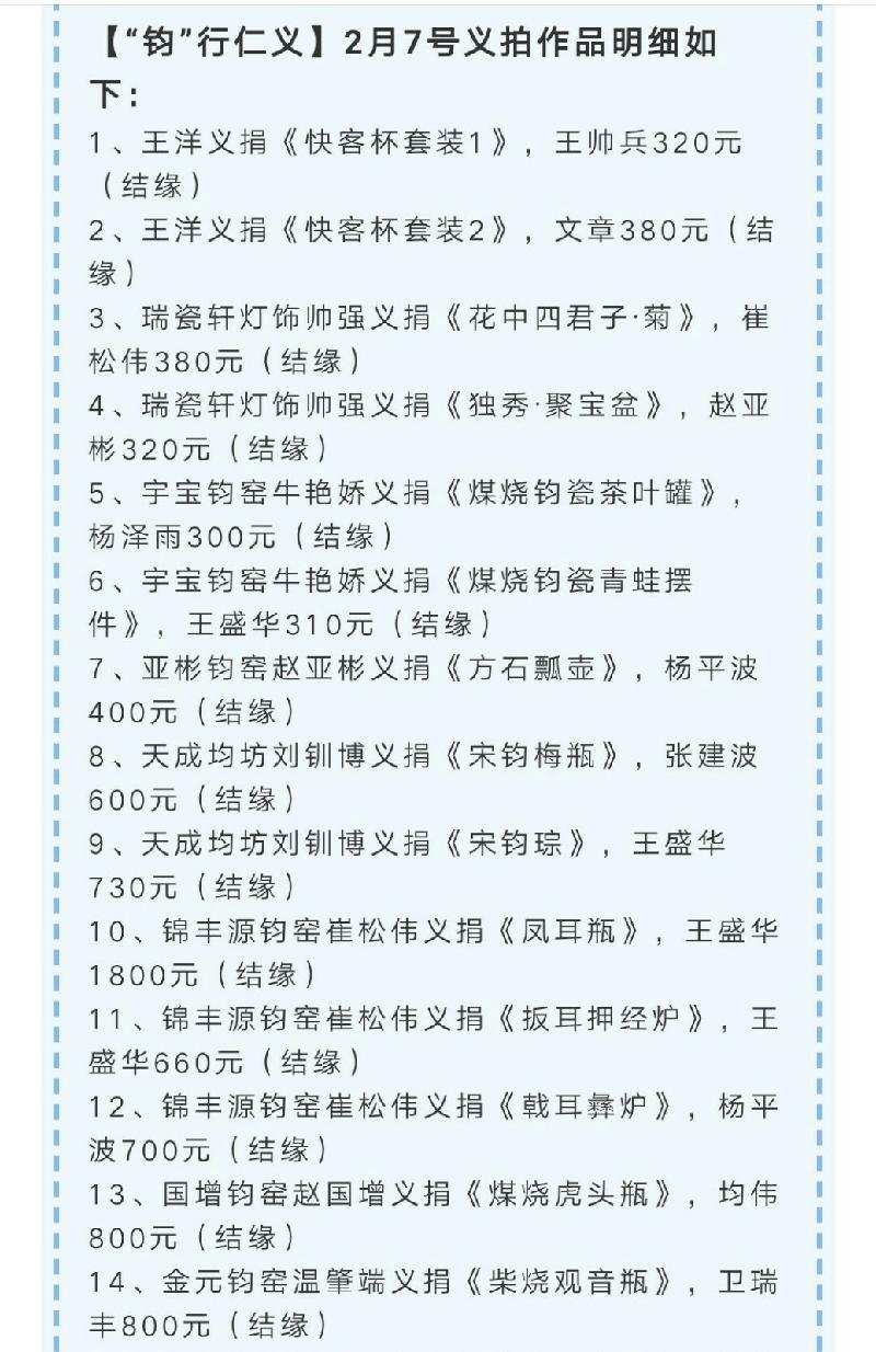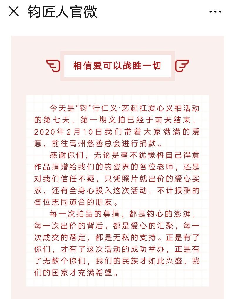 “感谢诸位同仁的爱心,相信有了你们的鼎力支持,我们一定会很快渡过难关,打赢这场疫情阻击战。目前为止形势依然严峻,我们也密切关注着疫情的发展,随时贡献自己的一份力量。这几日的义拍,让我们感受到了大爱,感受到了支持,感受到了大家迫切想为国家做一些事情。我们已经将包含群内全体家人的爱心捐给了禹州慈善总会,正是有了你们,所以我们的民族才充满希望,我们的国家才这样富强。第一期的义拍到处已经圆满结束,工作小组全体成员再次感谢各位的信任和付出。目前微信群已经完成历史使命,我们将对此群予以解散,如后续还有义拍活动,我们将在钧匠人微信公众号第一时间发布,请您随时关注动态信息。大爱无疆,感恩有你。