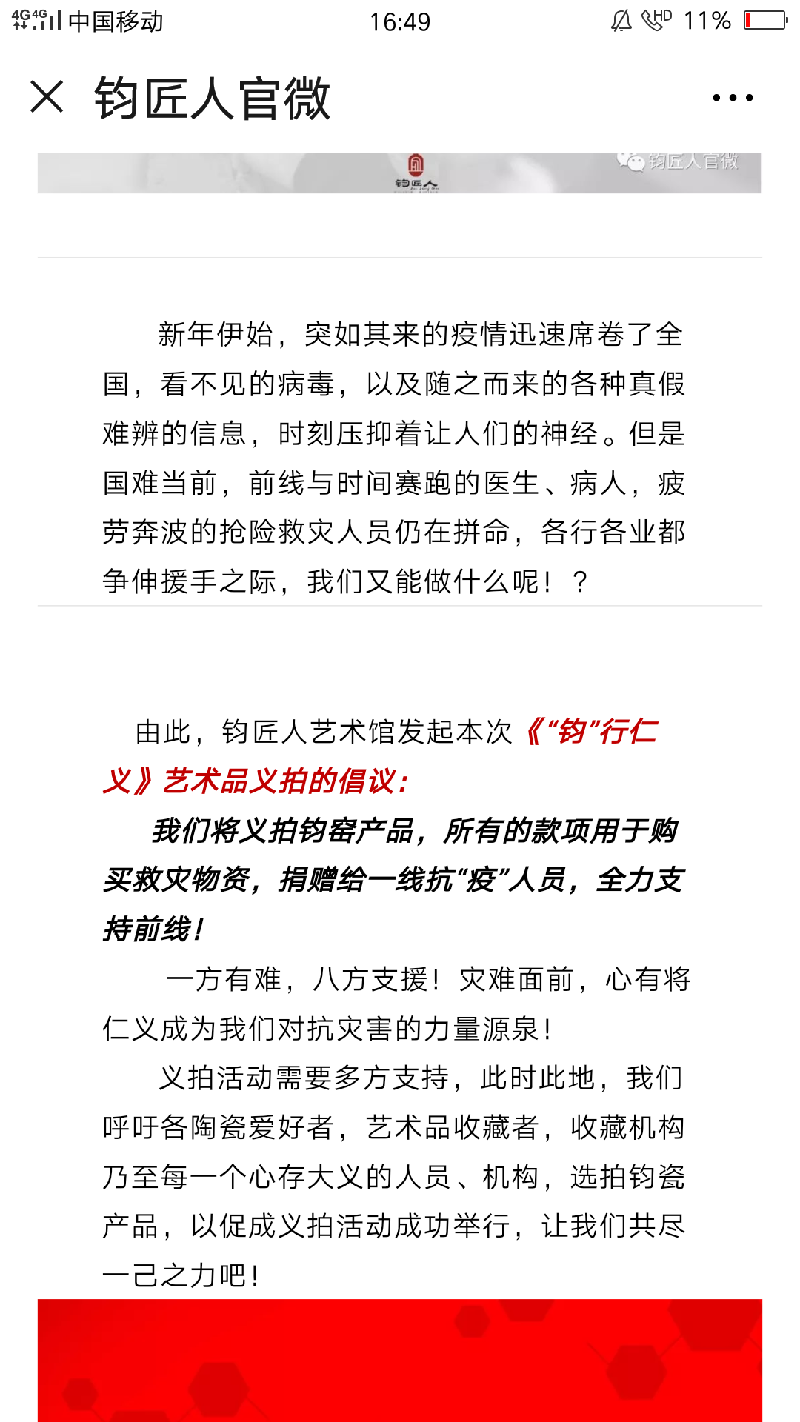 2020年2月5日,小编在微信朋友圈看到神垕钧瓷大师崔松伟分享的一篇《钧匠人官微》公众号文章:《“钧”行仁义》“艺起扛”钧瓷艺术品慈善义拍活动公开招募中,上边说: