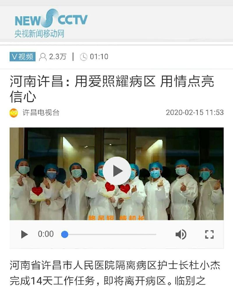 编者按:2020年2月15日,央视新闻报道许昌市人民医院隔离病区党员、护士长杜小杰抗击新型冠状病毒感染肺炎疫情感人事迹,现将文章予以转发交流。