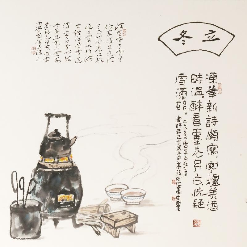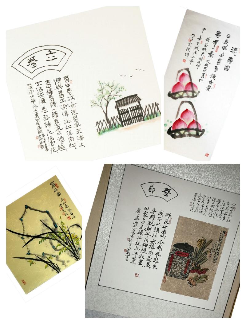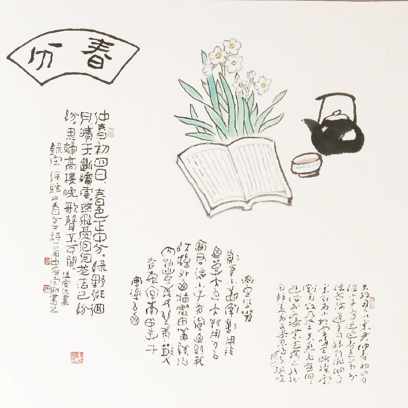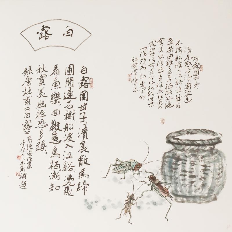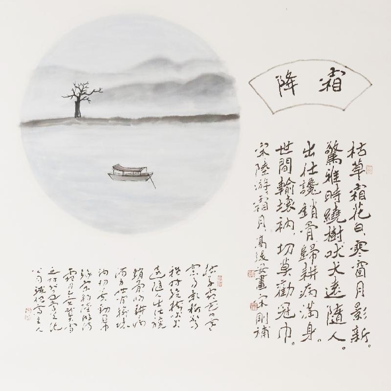 这一组节气图,诗、书、画三位一体,画风简洁淡雅,画面干净利落,布局疏淡有方,颇具看点……