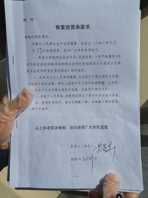文峰街道党工委坚持“两线”作战,疫情防控和复工复产同步抓。采用多渠道宣传、现场核查准备情况、签订恢复经营承诺书等,多措并举全力推动辖区服务业市场主体复工复业。