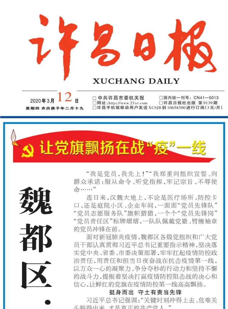 编者按:3月12日,《许昌日报》头版头题以《魏都区:战“疫”一线党旗红》为题,报道魏都区各级党组织和广大党员疫情防控工作做法,现将文章予以转发交流。