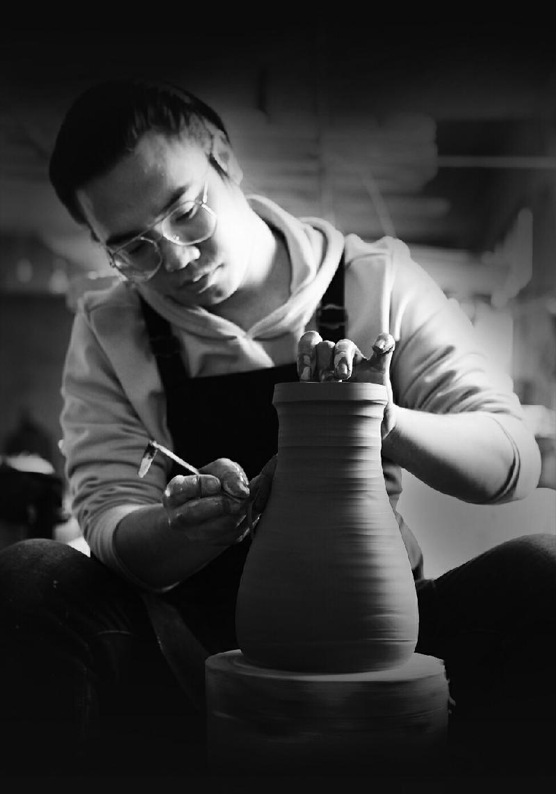 许仙年纪虽然不大,但是已经在神垕镇呆了七个年头了。刚开始来神垕镇时属于“客人”,每逢到神垕镇必喝倒,深深的被神垕镇的钧瓷文化和神垕朋友的热情所折服,在钧瓷轮廓与窑变上奔忙一阵后,也慢慢结识了神垕多位老师和朋友,时间久了以后,许仙开始尝试和老师们共同创作作品,许仙带来了年轻人活力四射朝气蓬勃的想法、独特而有美感的造型设计,结合神垕镇老师熟练的制瓷工艺和烧制技艺,联合作品一经推出便受到了市场的广泛好评。