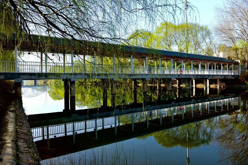 河水清澈,河面如镜般,倒映着两岸,河里有座花开的城;河上有座桥,连着你我的守望,城南花已开,你在城东还好吗?