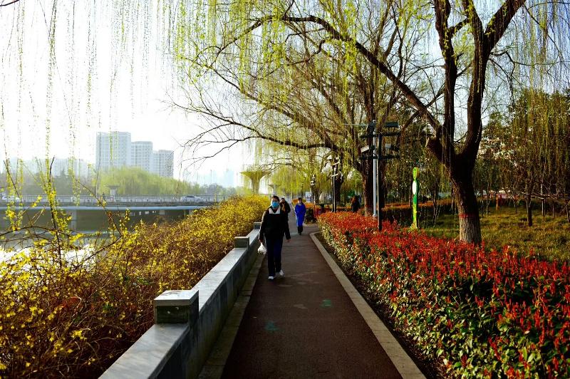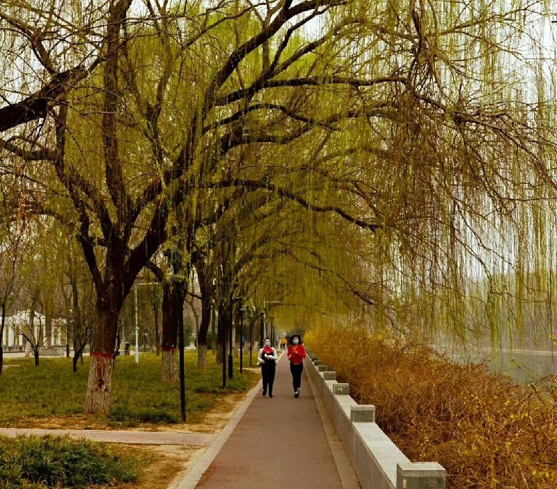 春天在路上,万物生,花在开,鸟在飞,清潩河的晨光中,路上有你……