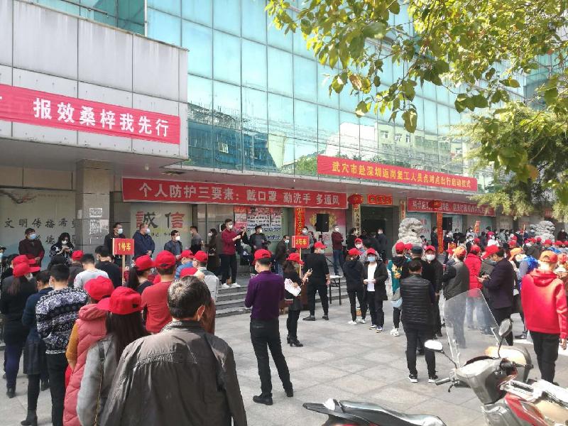 3月15日下午,湖北省武穴市艳阳高照,风和日丽。位于市人力资源和社会保障局办公大楼门前广场,打破冠状肺炎病毒防疫防控期间的宁静,迎来了258名来自各乡镇村组前往广东深圳市企业打工的农民工,人人露出久违的笑容,配合武穴市人社局、市公共就业与人才服务局工作人员为其豋记、测体温、发放口罩、出行标志以及随车待用纯净水、牛奶等饮用物品,有序侯车。这是武穴市新冠病毒疫情防控工作取得阶段性胜利后,关注和重视民生,首批欢送实行“点对点一站式”服务农民工外出务工的情景。
