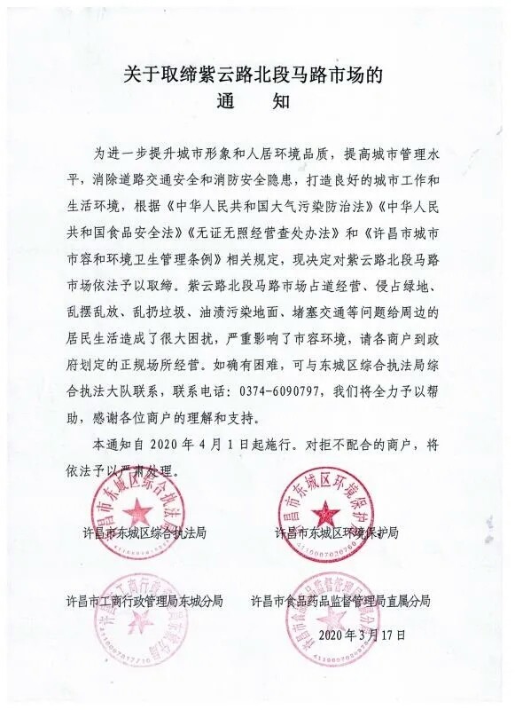 2020年3月17日,许昌市东城区综合执法局、许昌市东城区环境保护局等四部门联合发布通知,决定对紫云路北段马路市场(俗称“许昌学院小吃街”)依法予以取缔。