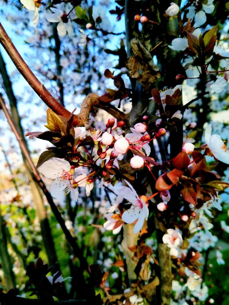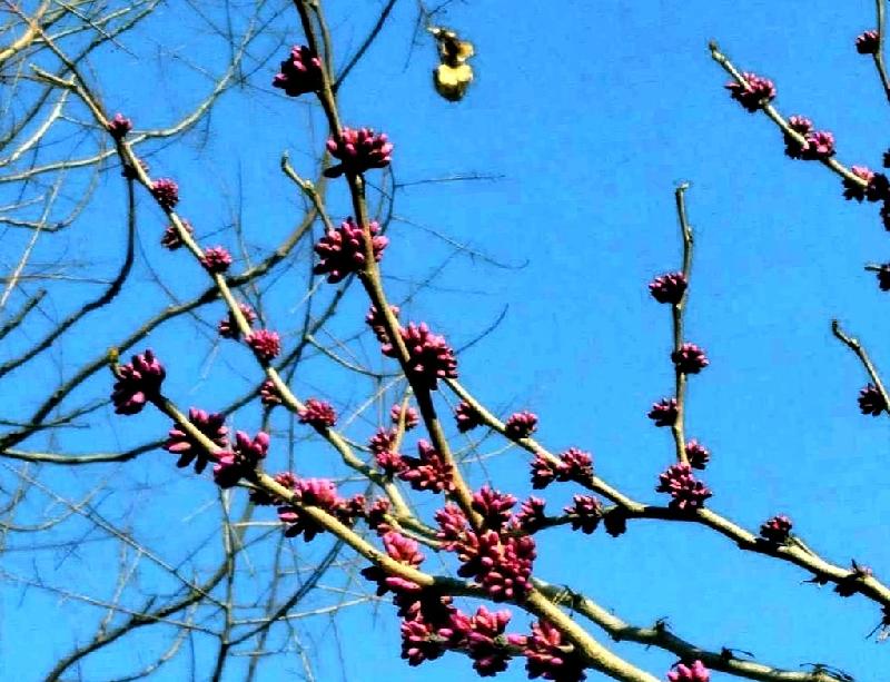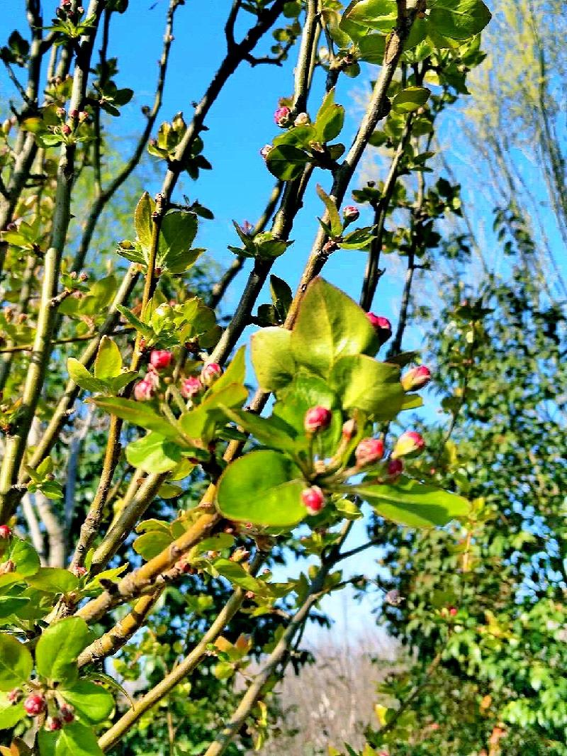 拐上这条路,便禁不住满心欢喜,春天早已把树儿,装扮得分外美丽。正蕴育着花苞的,已经开放了的,有叶的,没发叶的,高的,矮的,红的,绿的,一棵棵,一株株,热情地向我挥动着小手,争着抢着跟我打着招呼。我再也抑制不住内心的激动,看看这棵,摸摸那株,端祥端祥这一枝,细嗅细嗅那一朵。有的枝头,几片绿叶,衬着几个花苞,绿衬红底白面,好像十二三的女囡囡。有的枝头,挂着去年未落的小果果儿,干干的,褐红色,却还不瘪,似乎在向人们炫耀曾经的丰硕。不知道是不是海棠树。还有的,枝叶还没生发,花苞花儿,却提前缀满了枝枝桠桠。那深紫浅紫的花苞,还泛着点儿红,真让人满心欢喜。近看,满枝,远观,满树。站在树下仰望,在碧空的映衬下,更是美得无语。流连其中,沉醉不知归路。可前面的,还在满怀期待等人前往,我怎能停驻?我歉意地望望这些可爱的树,可爱的叶,可爱的花,“抱歉,亲爱的,我要到前面去。那里,还有你们的小伙伴儿在等着我呢!”