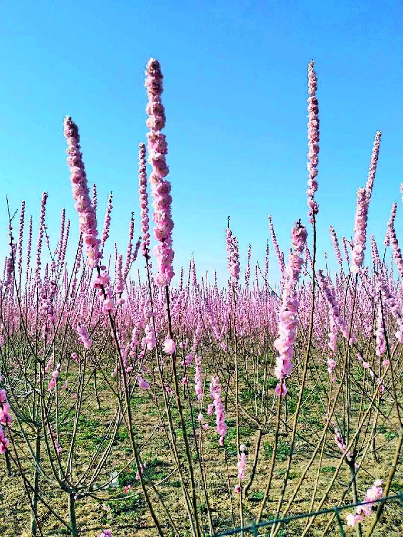 继续往前,不同的树儿和花儿,映入眼帘。停,停停!在前面,在那几株绿树掩映下,似乎有一大片粉!我晃晃脑袋,擦擦眼,仔细再看。真的!真的是一大片粉色!可似乎是桃花,又似乎不是。远看,那粉,像极了人工手绘。我加快脚步,来到近前。这才发现真的是一片桃红,可惜被近一人高的铁丝网,围在一个园子里。春光满园,美丽怎能禁锢?园子外,我拿起手机,贪婪地拍着、录着,心里乐开了花。这桃树,每一株,都从下面主干发出许多独立的枝条。这些枝条,下面略微划点儿孤,避免了与其他枝条挤压,不蔓不枝,枝枝向上,真绝。这些枝条,从中部到枝尖,全挤满了粉嫩粉嫩的花儿。一串又一串,一串又一串!我的口水都要下来了。妈呀,这也贼好看了!人常说粉面桃花,可在我看来,再美再娇的容颜,也比不上此时此地这满枝满枝的粉。这粉色,连成一片,似云,似海。让人想在里面徜徉,让人想在里面沉沦。这粉色,把我犯罪的念头都牵引了出来,看着那离得最近的花枝,我刚想伸手,“不能掐!不能掐!不能掐!这不文明!这是犯罪!”脑海里,女儿郑重的警告声尖锐地响起。我收回轻拂它的手,强压下占有欲。是啊,爱它,就要保护它!如果爱,带来的只有伤害,那还叫爱吗?我,用眼睛饕餮,我,用身心吸收。就让那芬芳,那粉色,刻驻在心里吧。