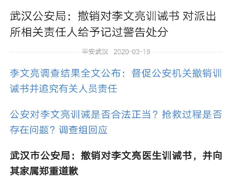 2020年2月7日,国家监委成立调查组,就群众反映的涉及李文亮医生的有关情况依法开展调查。3月19日,人民网等各大媒体报到调查结论……