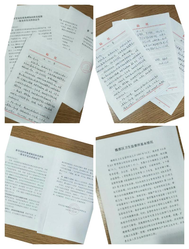“疫情就是命令,防控就是责任。许昌市魏都区卫生监督所作为2020年疫情防控的一线执法力量,始终保障人民群众生命安全和身体健康放在首位,进一步提高政治站位,强化责任担当,对疫情形势进行研判,紧抓疫情防控工作,全面部署,强化落实,细化责任分工。监督所全体人员包街包店到人,对公共场所、医疗机构等重点行业监管,压紧压实疫情防控各项工作、各个环节、各个岗位的责任,确保疫情防控期间卫生综合监督执法工作落实落地落细。”
