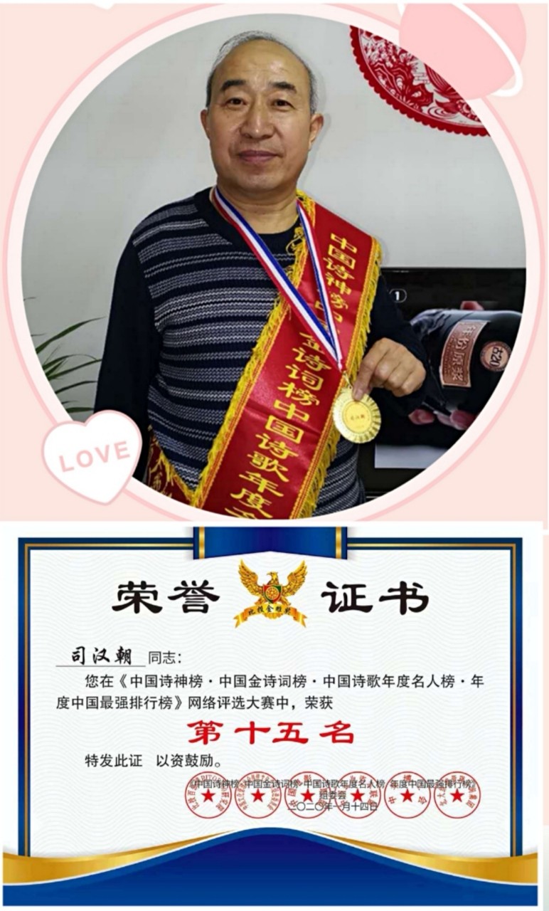 作者简介 司汉朝:笔名(微信号)慧眼诗英雄。河北省冀州区第四实验小学工作 。中华诗歌联合会执行主席兼河北文学社社长,冀州区诗词学会会员,入选《中国诗神榜.中国金诗词榜.中国诗歌年度名人榜》 部分作品在《世界诗歌联合总社》《世界作家文集》《当代大作家》《都市头条》等地、市多家平台推出。