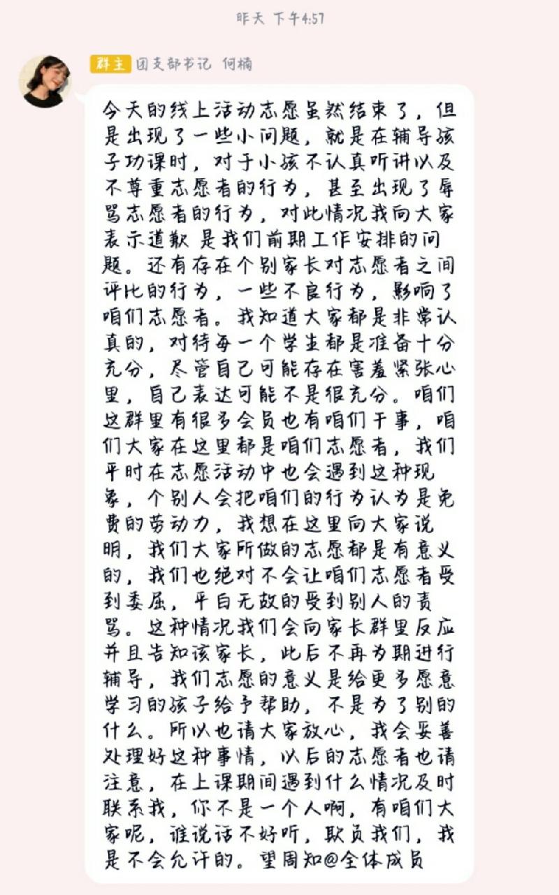 在之后的线上课堂中,志愿者们一如既往,细心地为孩子们讲解知识点,解答孩子们的疑问。当面临一位上中学的小女孩对英语语法知识不甚熟悉,对英语题目束手无策的情况时,志愿者们先是采用了耐心讲解语法知识的方法,他们将那些知识一条一条地列出来,逐个剖析。在这种方法收效甚微时,他们又充分运用自己所学到的教育学知识,将知识点融入到具体的例子之中。通过对例子的讲解,深化小女孩对知识的理解。除此,志愿者们还为她出了一些题目,帮助小女孩熟练掌握知识点,并做到举一反三。那位小女孩的家长在看到志愿者们对孩子的学习如此上心,在课下对志愿者们表示了真诚的谢意。