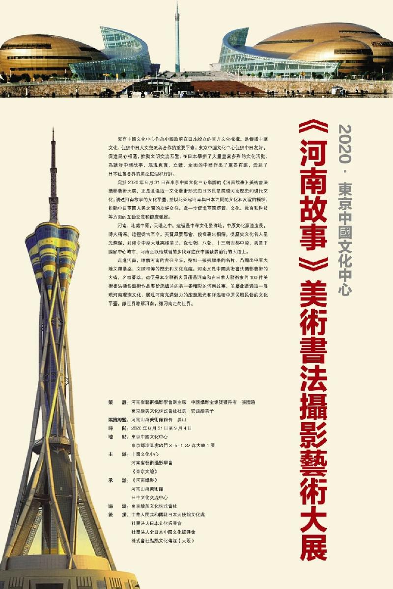 定于2020年8月31日在东京中国文化中心举办的《河南故事》美术书法摄影艺术大展,正是通过这一文化艺术形式向日本民众展现河南历史和现代文化,讲述河南故事的文化平台,並以此架起河南与日本之间的文化和友谊的桥梁,推动中日两国人民之间的友好交往,进一步促进两国经贸、文化、教育和科技等方面的互动交流和健康发展。