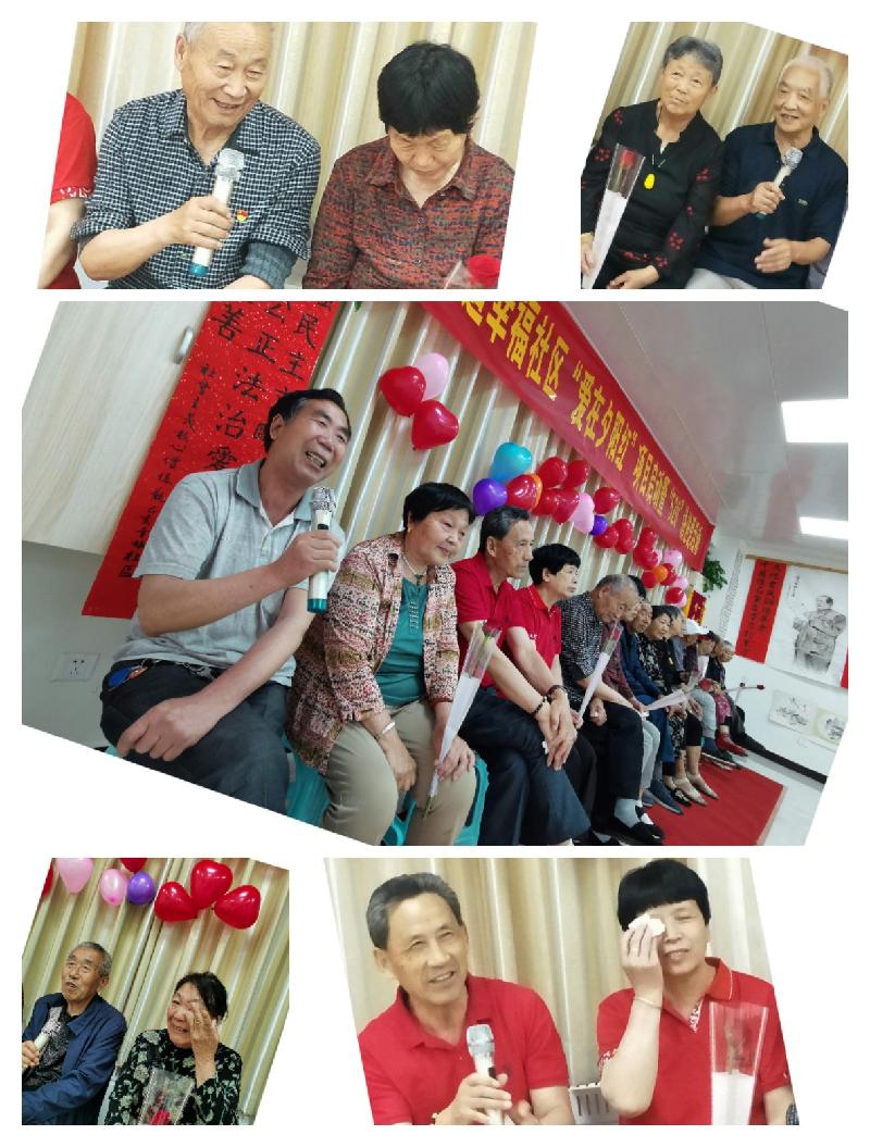 活动第三项:分享爱情故事,这七对幸福的伴侣大都相伴携手了四五十年,都分享了自己的爱情故事,讲述了两人当初是怎么认识的,结婚这么多年难忘的事,相伴几十年想对彼此说的话。“我特别要感谢我的老伴,我是个民办教师,和老伴是经人介绍认识的,老伴嫁给我,一直辛苦照料家庭,我父亲由于身体原因没有劳动能力,家庭的重担几乎都在老伴身上,我想对老伴说的话是:谢谢你老伴,我希望咱俩还能再携手幸福生活30年!”民办教师郑志勋老人正娓娓道来,给社区居民分享自己走过半个世纪的爱情故事。田思周老人已经80岁高龄了,曾是位军人,和妻子陈素凤已经结婚53年了,他们表示感谢党的领导,现在的日子过的越来越好,儿女也孝顺,陈素凤老人笑谈当初结婚时不兴送彩礼,丈夫送的镰刀、锄头、脸盆,让自己记忆深刻。蔡玉兰夫妻讲述了他们的故事,他们是自由恋爱,一个是教师,一个在兵工厂工作,两人相濡以沫,已经携手相伴50多年了,两人一直和和睦睦相敬如宾,黄友宗老人说:“老伴,谢谢你的辛苦付出,希望咱们能一直幸福走下去”。他们的爱情朴实无华却感人至深,听似普通却发人深省,听了他们的故事,大家都被感动了。