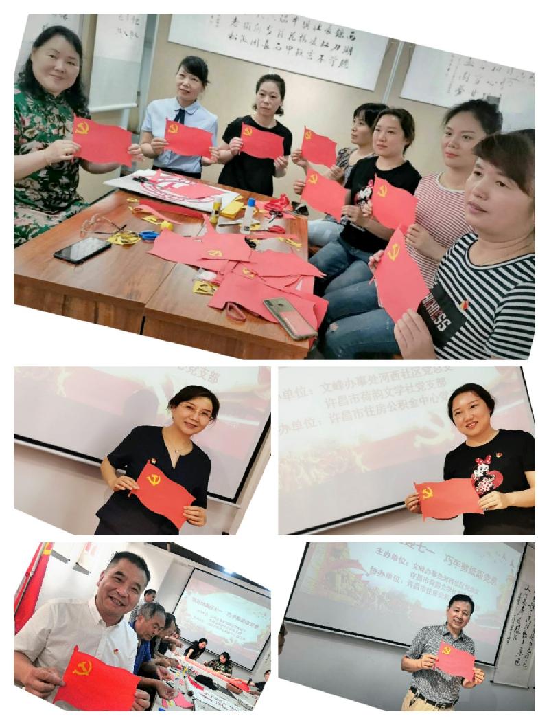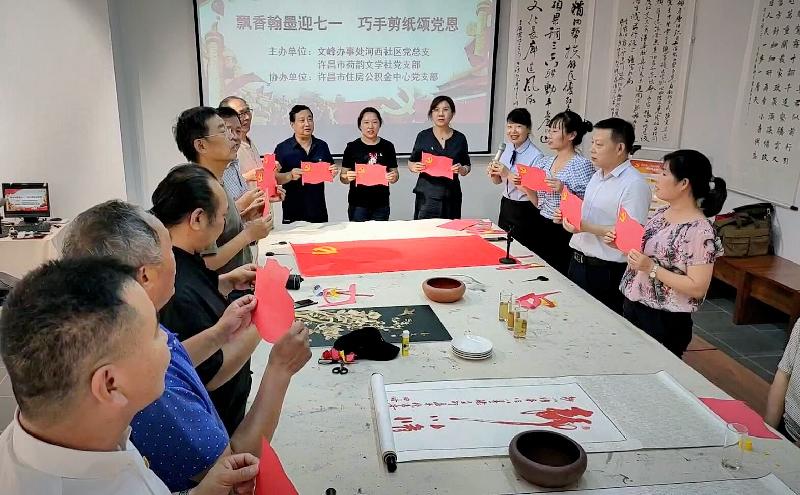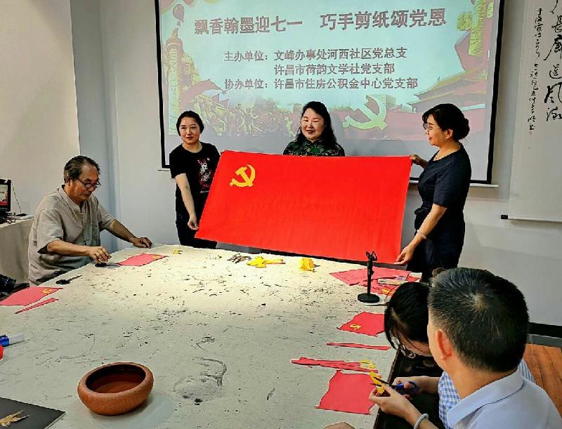 2020年6月29日上午,许昌市魏都区文峰办事处河西社区党总支部、许昌市荷韵文学社党支部、许昌市住房公积金中心党支部共同开展了“飘香翰墨迎七一 巧手剪纸颂党恩”活动,文峰办事处河西社区党总支书记张琳、荷韵文学社党支部书记武保莉为活动致辞。活动特别邀请 许昌市肖像剪纸艺术家田秋香女士,带领同志们进行党旗剪纸制作,用这种传统民间的艺术形式表达大家对建党99周年的热情。