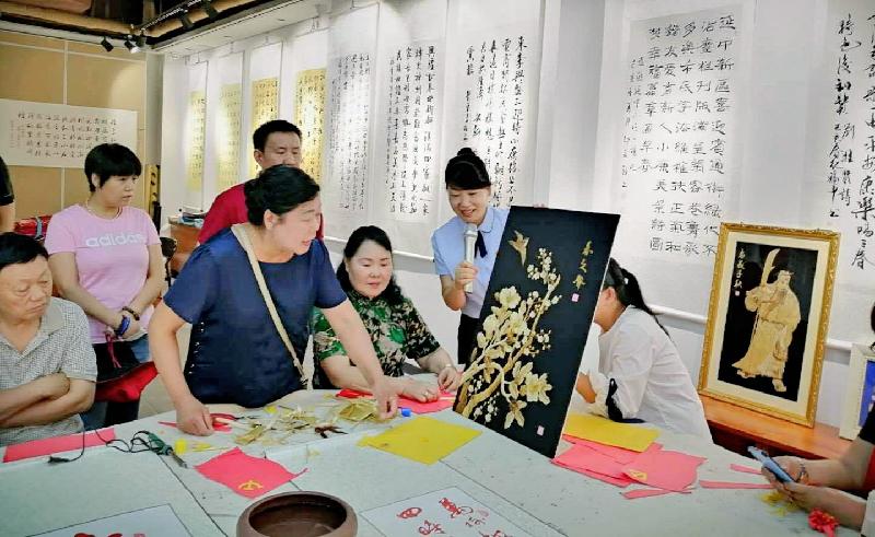 麦秆画是以农村最普通的麦秆、高粱秆等为原料的一种剪贴艺术。在活动现场,非遗传承人郭慧琴女士为大家介绍了麦杆画的制作工艺并现场示范制作。