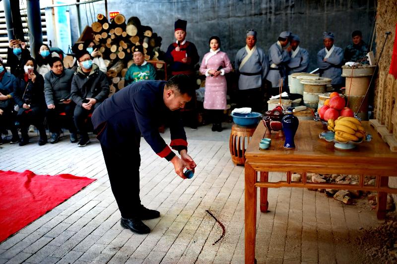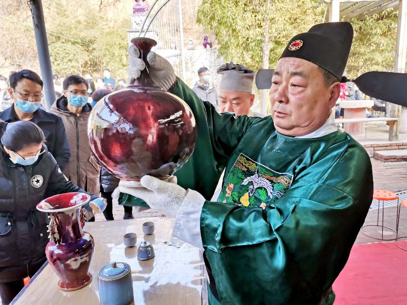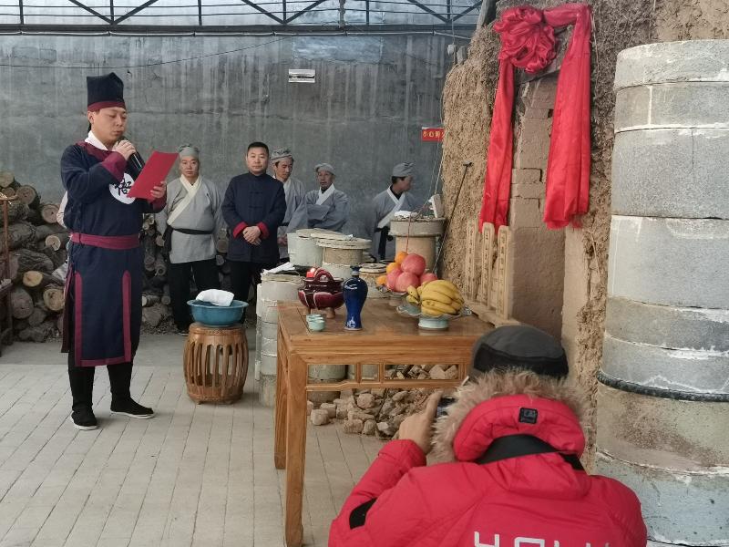锦丰源钧窑掌门人崔松伟净手、上香、敬酒,带领窑工师傅一起祭拜窑神