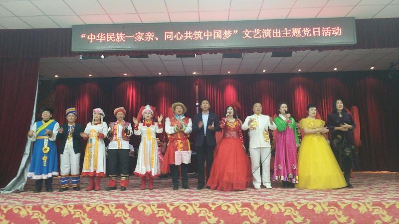 下午在东北亚社区四楼“百姓大舞台”参加东北亚社区党日活动。举办单位有:东北亚党委、春风艺术团、志愿者文艺队。在演员手捧“五星红旗”唱着《五十六个民族 五十六朵花》的歌声中拉开演出帷幕。东望学雷锋志愿者文艺队为观众奉献舞蹈《敬祝毛主席万寿无疆》她们穿着各民族服装,精神饱满,优美的舞姿赢得阵阵掌声,这个舞蹈勾起人们对毛主席的无限怀念;吴红梅老师是达斡尔族,代表少数民族表演诗朗诵《勇敢美丽的达斡尔》歌颂勤劳勇敢的牧民;志愿者的绸子舞《舞动中国》舞起来,大家舞起来,舞动中国梦,让生活精彩,舞出时代的风采。演出在春风艺术团演唱歌曲《红太阳照边疆》《万岁毛主席》《三峡情》等欢快的歌曲联唱声中结束。台下的观众也受到感染,纷纷称赞节目演得精彩,期待着下次演出。一场歌颂祖国、歌颂人民大团结的红歌红舞,激励着中国人民,只有各民族团结一心,祖国才会越来越繁荣富强。