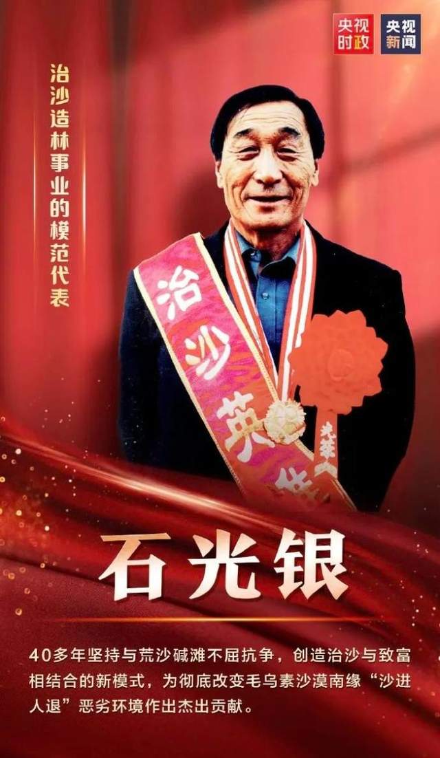 石光银,18岁时入党。三十多年来,他带领一伙陕北硬汉,历经千辛万苦,在承包的25万亩国营、集体荒沙碱滩上种活了5300多万株(丛)乔灌木林,在毛乌素沙漠南缘营造了一条长百余里的绿色长城,彻底改变了“沙进人退”的恶劣环境,取得了明显的社会效益、生态效益、经济效益。不忘帮扶困难群众,造福当地百姓,自筹资金120多万元,修建学校两所,生态移民村一个,帮扶困难群众三百多户。通过发展沙产业,把治沙与农民脱贫致富相结合,使农民在治沙中得到实利。2012年陕西省省第十二次党代会选举石光银为十八大代表;陕西省第十三届人民代表大会代表,第十三届全国人民代表大会代表。