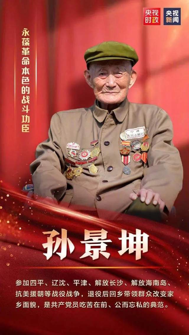 孙景坤颁奖词:参加了四平、辽沈、平津、解放长沙、解放海南岛、抗美援朝等战役战争,退役后他毅然回乡带领群众改变家乡面貌,是共产党员吃苦在前、公而忘私崇高品质的典范。