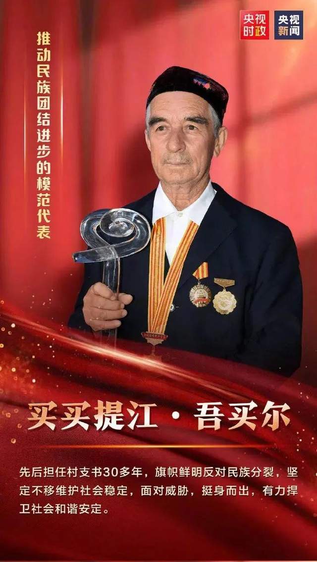 买买提江.吾买尔颁奖词:推动民族团结进步的模范代表,先后担任村支书30年,旗帜鲜明反对民族分裂,坚定不移维护社会稳定。面对威胁,挺身而出,有力捍卫社会和谐安定。