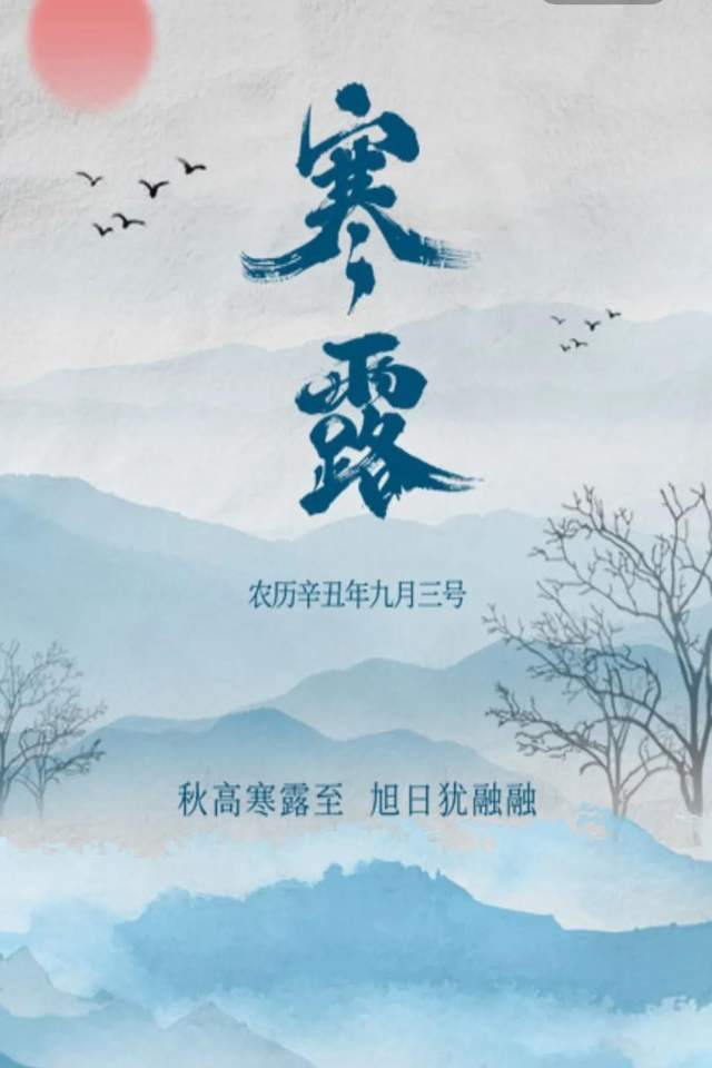 寒露时节,虽少了些喧闹热烈;却多了阔达深邃的宁谧。你看那风起白苹,霜染红叶;冷露横江,菊有黄华;分明是江山入笔,舒朗人间!寒露,也是十一长假后的第一个工作日,悠长的假期结束了,让我们调整好心情、振奋起精神,仿佛雍雍鸣雁一般,不为秋愁所扰,元气满满的迎接新时光吧!