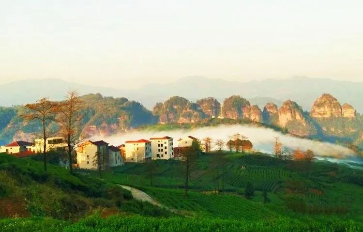 外婆坑寨今蓬勃,云雾名茶绿满山。