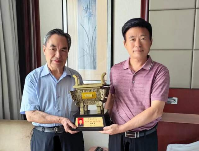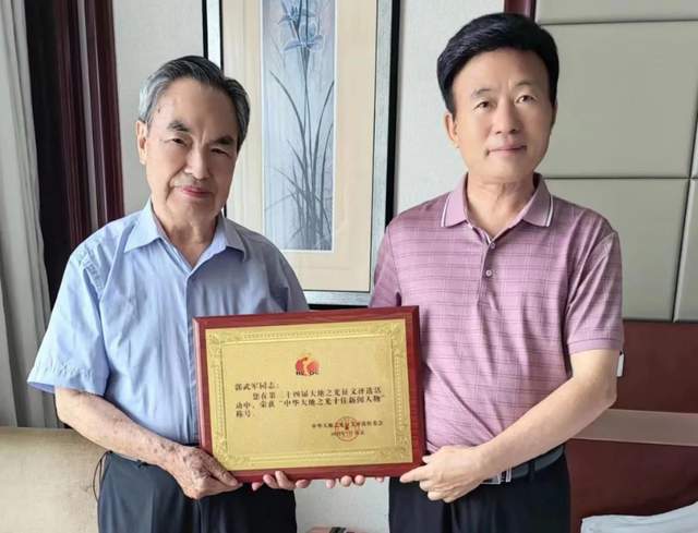 中国记者协会原国內部主任阮观荣与郭武军合影留念。