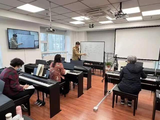水利部老年大学近两年陆续将教室全部进行升级改造,实现了书画类、器乐类、形体类和讲解类课堂的功能区分和智慧教室的全覆盖,使原线下课程的线上复课率达到80%以上,全体教师也都回到线下原班教室进行授课。在智慧教室的硬件配置方面,学校根据直播教学的播放效果和操作方式,不断对硬件功能提出新的要求。近两年,持续更新设备设施,增加了双屏笔记本操作平台、移动跟踪式摄像镜头和自动调整焦距的立式镜头,更好地解决了舞蹈课学员对于老师镜面演示的需求、书法绘画课学员对于老师行笔方法的需求以及器乐课学员对于老师指法动作的需求。在软件系统方面,学校将原先各自独立的报名缴费系统和课程直播app进行数据整合,全新推出一站式服务的微信小程序,为老年学员提供了更加便捷的操作流程和更加优质的使用感受。此外,应学校要求,睦课在线教育平台通过整合数后台数据,利用可视化技术为支撑,专门研发了大数据大屏展示系统,并安装在校园文化墙上,实时更新学校相关教学管理数据,使学员上课动态和系统运行情况完全可视化,一目了然,为教学管理提供了有力的数据支撑和决策依据。