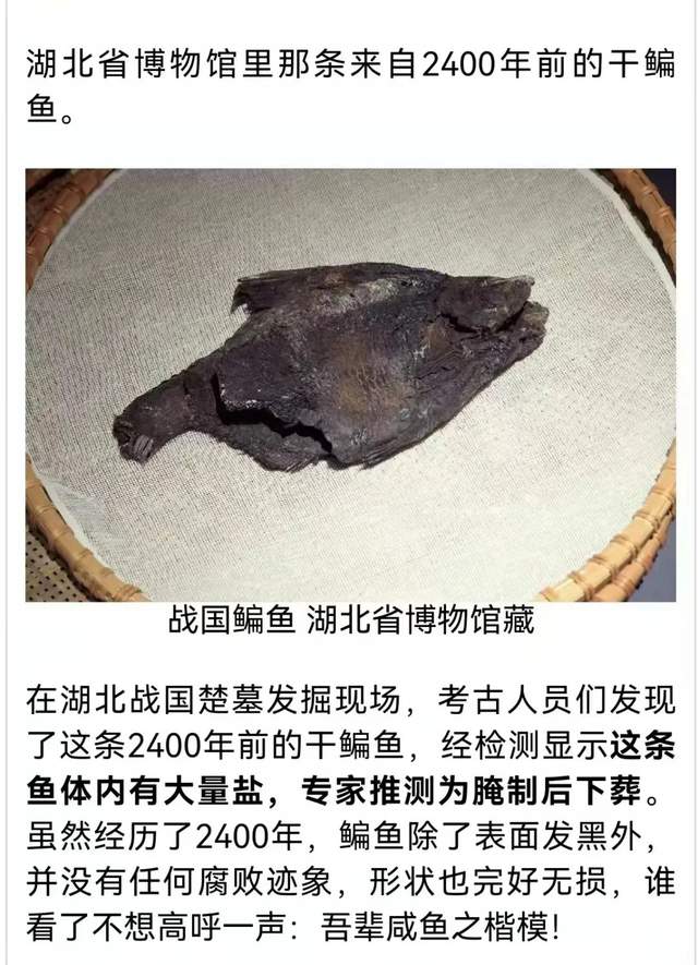 不久前,鄂州一位文史专家从湖北省博物馆拍摄回一张照片,用微信转发给我。照片上是一条2400多年前的战国鳊鱼,释文介绍是2014年在位于湖北荆州中学准备乔迁新居动工新建校址分布古墓群中发掘出来的,且经检测显示,这条鳊鱼体内有大量盐,从鳊鱼表面看,仅显得发黑,并没有任何腐败迹象,形状也完好无损,专家推测为战国楚墓的腌制后的陪葬品。