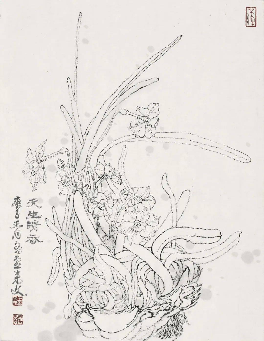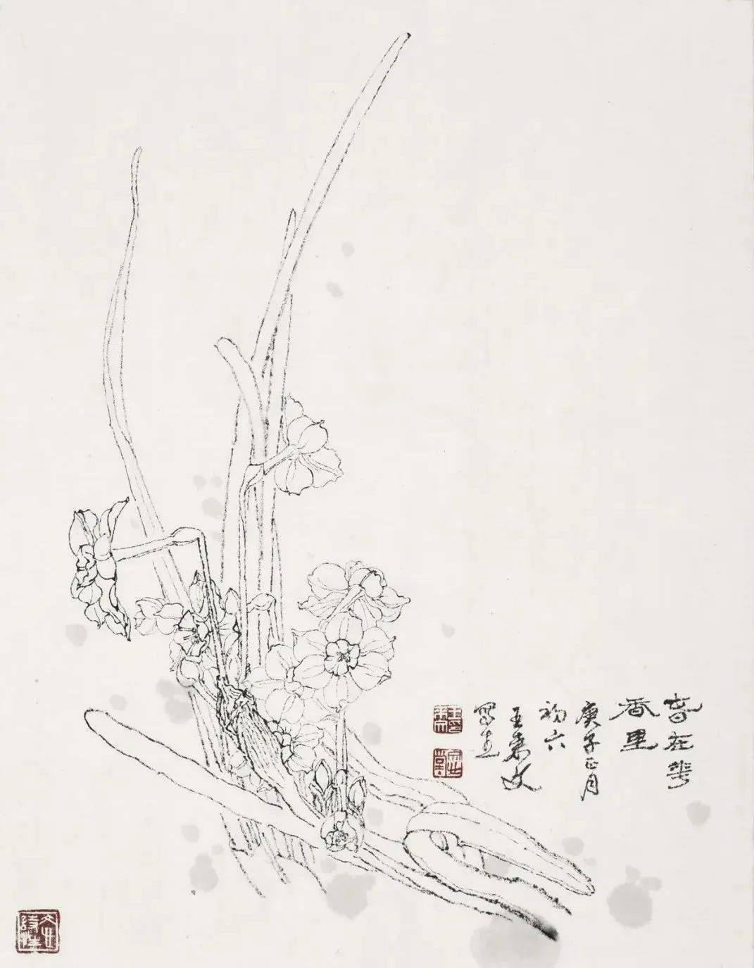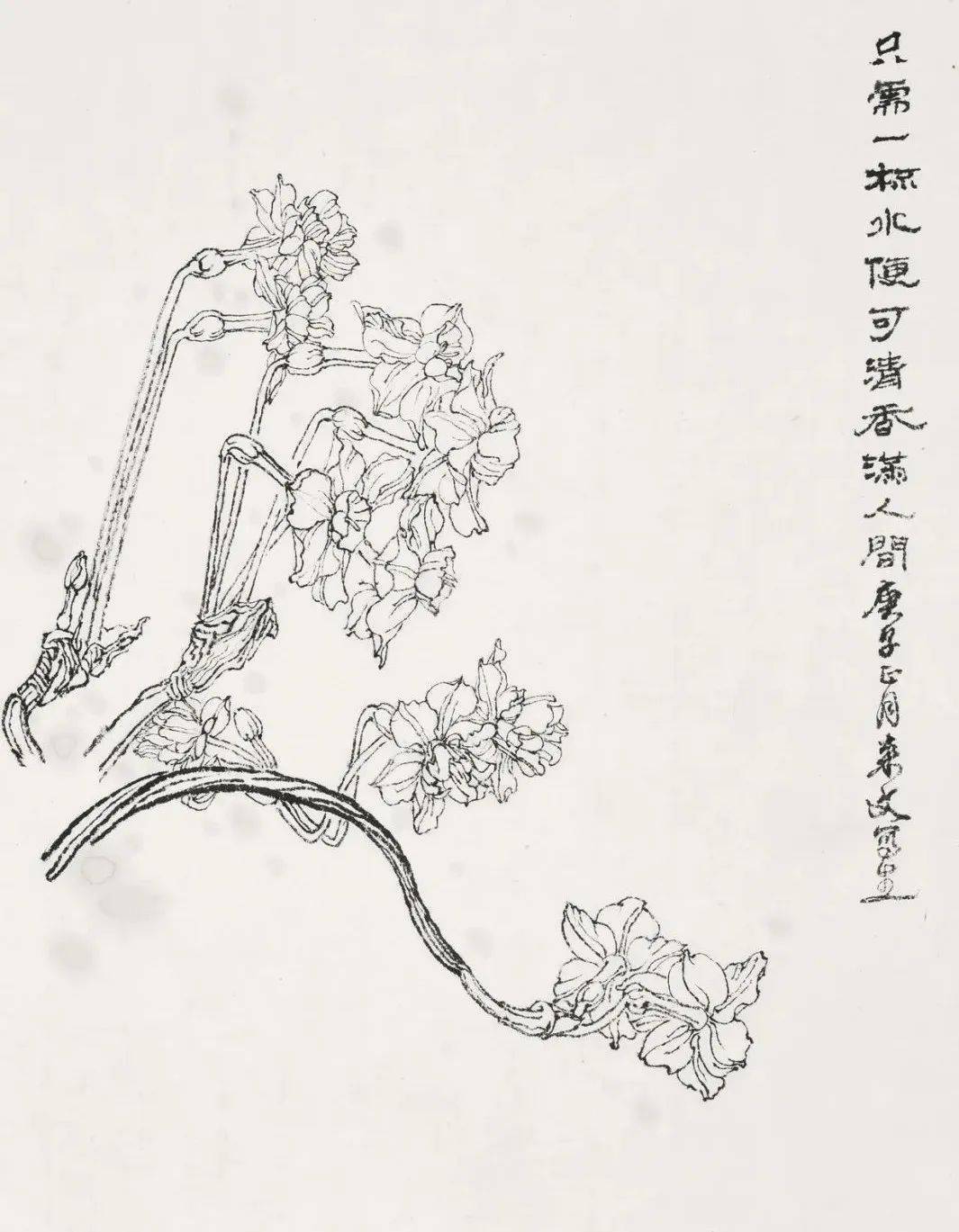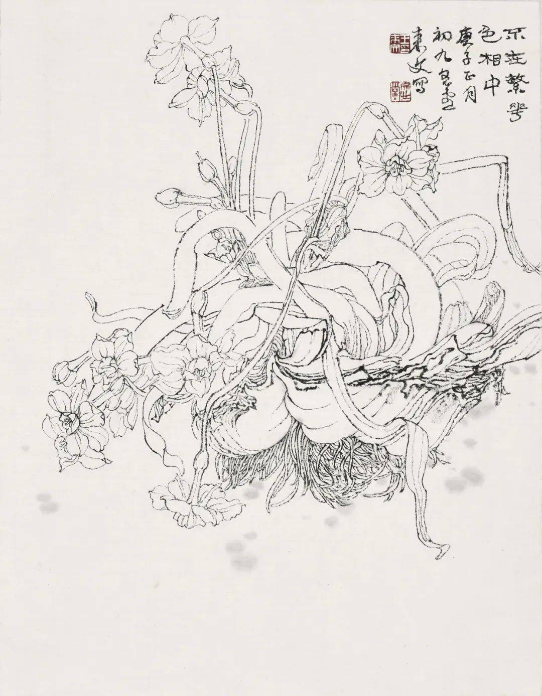 纵观来文兄笔下的白描作品,线条或顿挫如屋漏,或古朴老辣,或流畅似行云。借线的长短粗细、轻重缓急、曲直方圆、虚实疏密、浓淡干湿,枯焦重厚等多方面表现物象的质地感、动态感,以线构成的空间感。他的白描花卉,一扫粉黛之气,笔墨洗练超逸,线条绵延流畅,犹如“春蚕吐丝”。所绘作品笔精墨妙,形神兼备。
