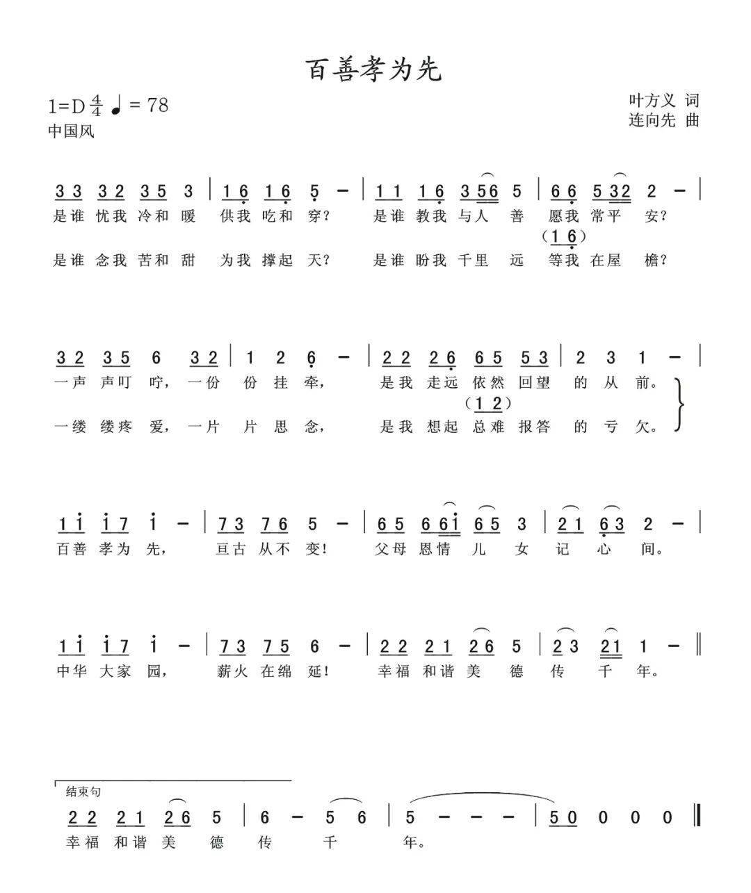 孝也是植根于亲子之间的血缘亲情,是维系家庭关系、促进家庭和睦的基石,也是社会稳定和谐的需要,从这一点来看,孝的德行又具有普遍的推行意义。于是,歌曲《百善孝为先》就应运而生了!
