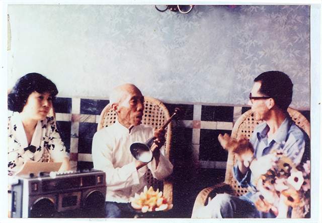 鄂州市群艺馆专家邵文川(右)、周宜容(左)与七房塆牌子锣传承人陈新凤老人(中)交谈(1986年)