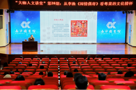 2月26日下午,由广州市南沙区文化广电旅游体育局主办、南沙区图书馆与广州岭南文化研究会承办的第26期“大咖人文讲堂”——《从李渔《闲情偶寄》看粤菜的文化情怀》活动如期开讲,现场约200名读者参与了讲座活动。