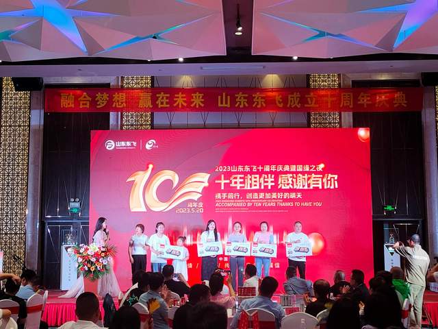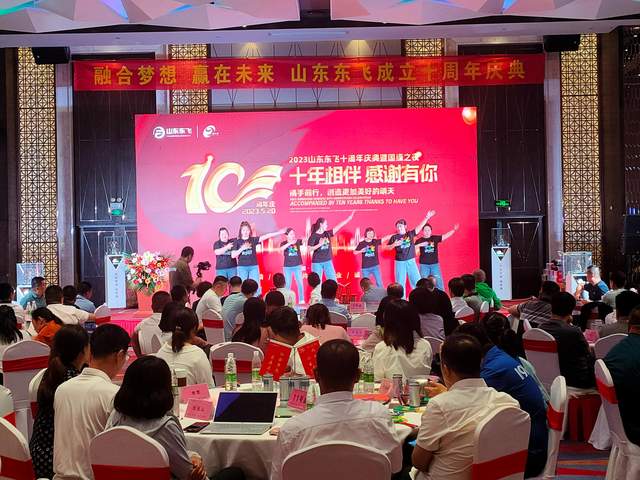 和风煦暖,大地小满。2023年5月20日,在这个充满了爱意的日子,山东东飞酒业迎来了成立十周年华诞。东飞在过去十年的发展历程中,以人文本、客户至上、诚信经营、不断探索、合作共赢,开拓进取,稳步前行,取得了良好业绩,为总结过去、感恩各界,激励员工,大家共同成长进步,东飞酒业在济南铂尔国际大酒店举行了隆重的十周年庆典活动。出席本次活动的有:山东省人民政府办公厅高中东先生、东飞酒业董事长范全勇、总经理解诚、今世缘酒业纪委副书记邹长春、 山东大区总经理薛丰明、青岛崂山公司执行董事王利 、山东汇通达公司自营总经理薛汝良、陕西西凤山东省公司总经理任兴伟、上海九州滋润供应链公司总经理张鹏等。